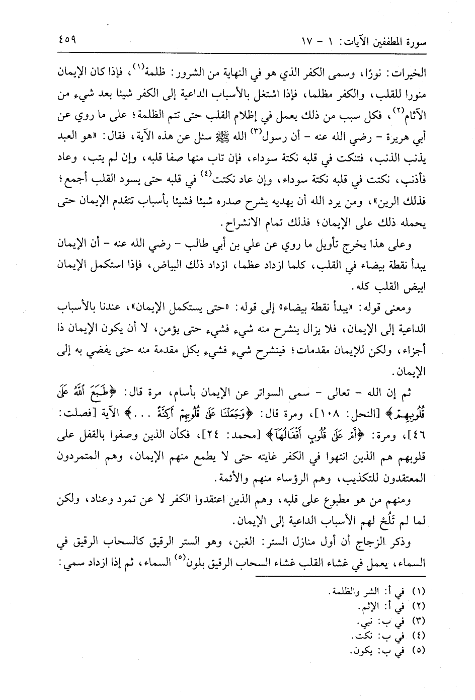 الخيرات: نورًا، وسمى الكفر الذي هو في النهاية من الشرور: ظلمة، فإذا كان الإيمان منورا للقلب، والكفر مظلما، فإذا اشتغل بالأسباب الداعية إلى الكفر شيئا بعد شيء من الآثام، فكل سبب من ذلك يعمل في إظلام القلب حتى تتم الظلمة؛ على ما روي عن أبي هريرة - رَضِيَ اللَّهُ عَنْهُ - أن رسول اللَّه - صَلَّى اللَّهُ عَلَيهِ وَسَلَّمَ - سئل عن هذه الآية، فقال: " هو العبد يذنب الذنب، فتنكت في قلبه نكتة سوداء، فإن تاب منها صفا قلبه، وإن لم يتب، وعاد فأذنب، نكتت في قلبه نكتة سوداء، وإن عاد نكتت في قلبه حتى يسود القلب أجمع؛ فذلك الرين "، ومن يرد اللَّه أن يهديه يشرح صدره شيئا فشيئا بأسباب تتقدم الإيمان حتى يحمله ذلك على الإيمان؛ فذلك تمام الانشراح.