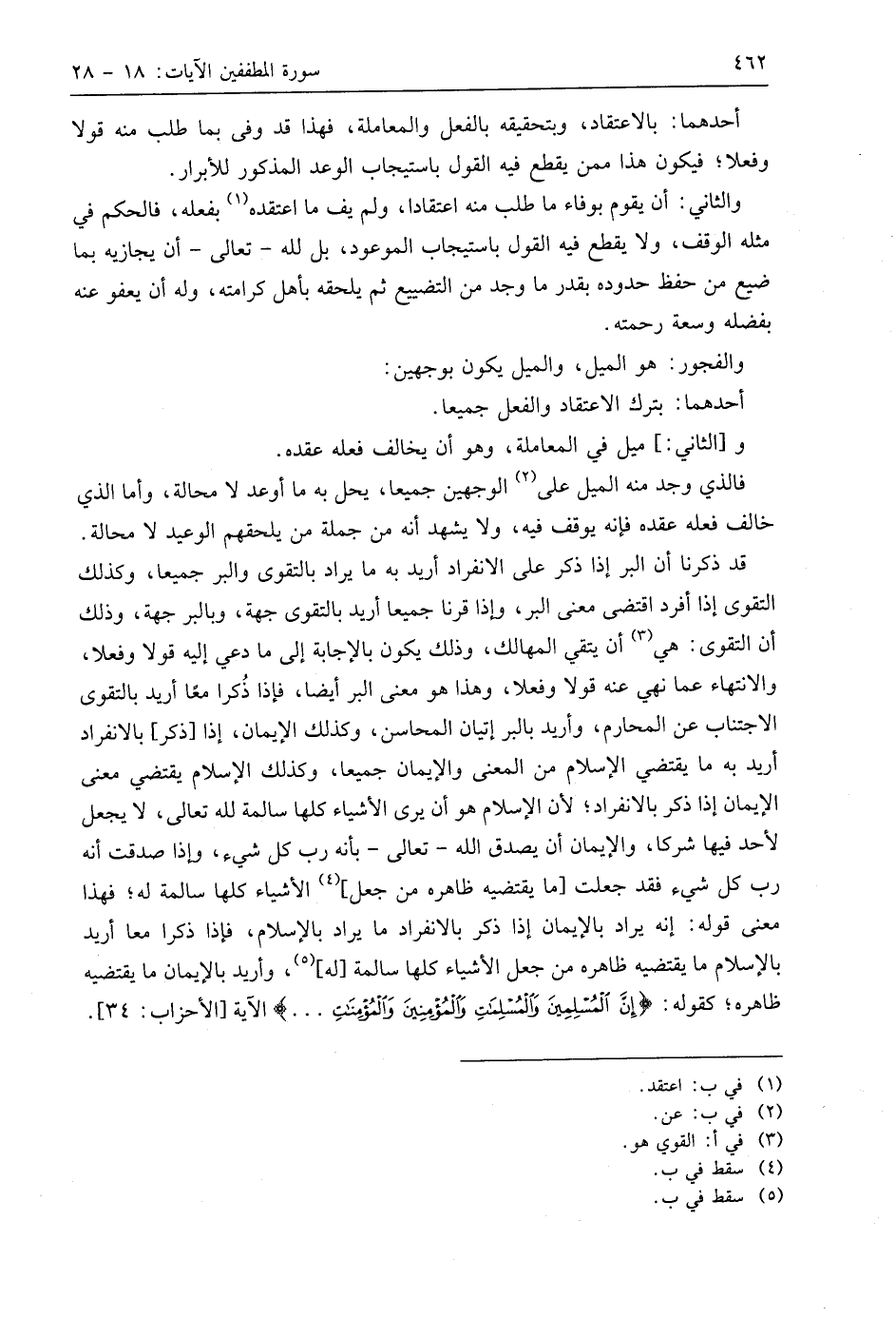 أحدهما: بالاعتقاد، وبتحقيقه بالفعل والمعاملة، فهذا قد وفَّى بما طلب منه قولا وفعلا؛ فيكون هذا ممن يقطع فيه القول باستيجاب الوعد المذكور للأبرار.