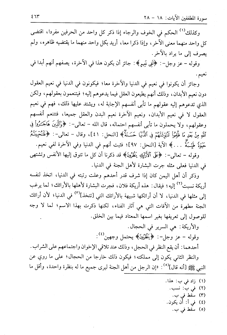 وجائز أن يكونوا في نعيم في الدنيا والآخرة معا؛ فيكونون في الدنيا في نعيم العقول دون نعيم الأبدان، وذلك أنهم يطيعون العقل فيما يدعوهم إليه؛ فيتنعمون بعقولهم، ولكن الذي تدعوهم إليه عقولهم ما تأبى أنفسهم الإجابة له، ويشتد عليها ذلك، فهم في نعيم العقول لا في نعيم الأبدان، ونعيم الآخرة نعيم البدن والعقل جميعا، فتتنعم أنفسهم وعقولهم، ولا يحملون ما تأبى أنفسهم احتماله، قال اللَّه - تعالى -: (وَالَّذِينَ هَاجَرُوا فِي اللَّهِ مِنْ بَعْدِ مَا ظُلِمُوا لَنُبَوِّئَنَّهُمْ فِي الدُّنْيَا حَسَنَةً)، وقال - تعالى -: (فَلَنُحْيِيَنَّهُ حَيَاةً طَيِّبَةً. . .) الآية؛ فثبت أنهم في الدنيا وفي الآخرة لفي نعيم.