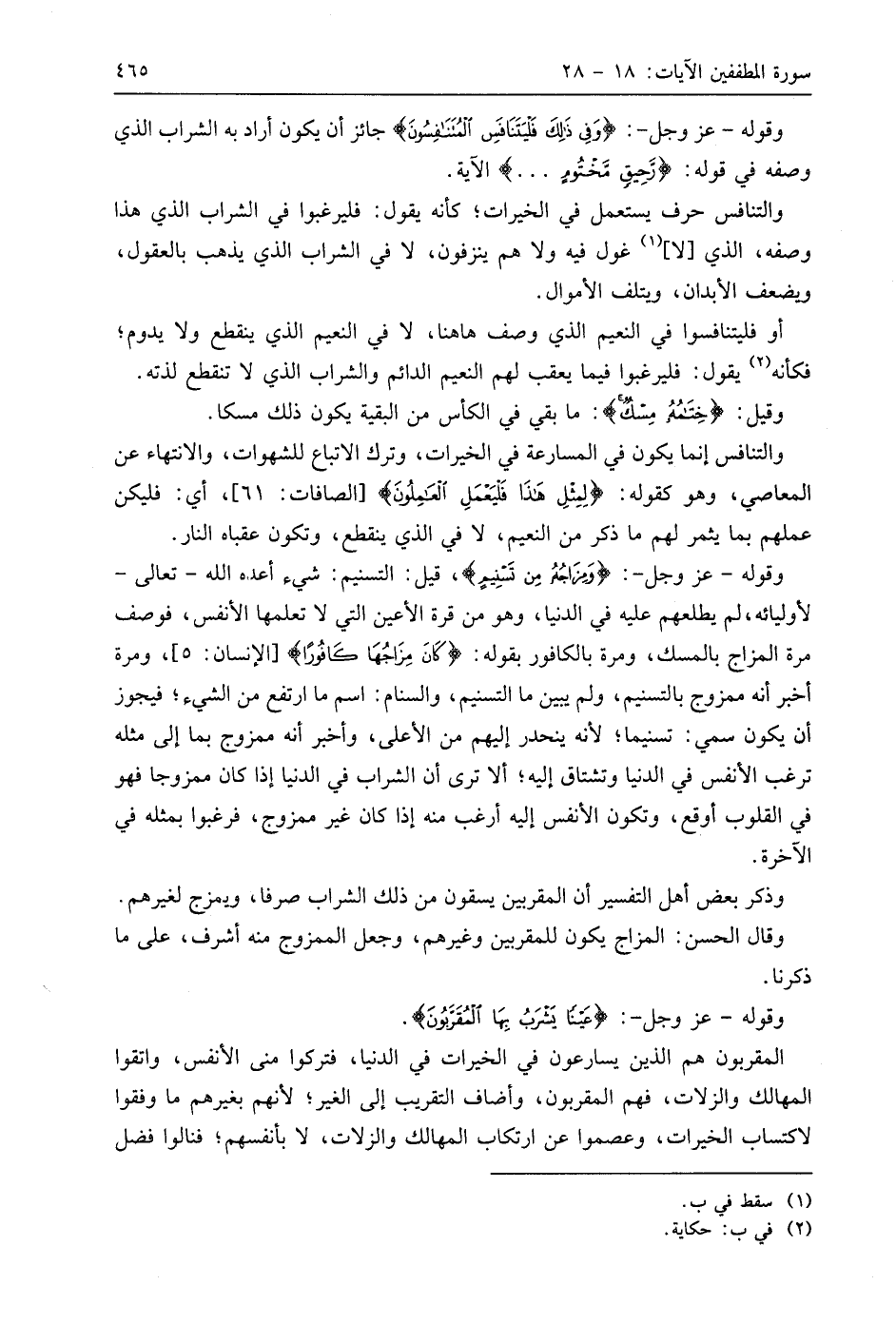 وقوله - عَزَّ وَجَلَّ -: (وَفِي ذَلِكَ فَلْيَتَنَافَسِ الْمُتَنَافِسُونَ) جائز أن يكون أراد به الشراب الذي وصفه في قوله: (رَحِيقٍ مَخْتُومٍ. . .) الآية.