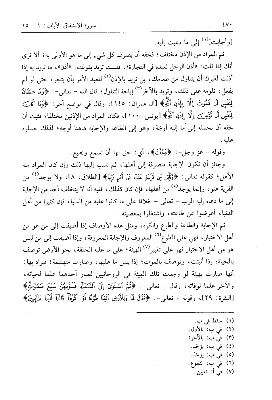 ثم الإجابة والطاعة والطوع والكره، ومثل هذه الأوصاف إذا أضيقت إلى من هو من أهل الاختيار، فهي على الطوع المعروف والإجابة المعروفة، وإذا أضيفت إلى من ليس هو من أهل الاختيار فهو على تغيير الهيئة؛ على ما عليه الخلقة، نحو الأرض توصف بالحياة؛ إذا أنبتت، وتوصف بالموت؛ إذا يبس ما عليها، وصارت متهشمة؛ فيراد بها: أنها صارت بهيئة لو وجدت تلك الهيئة في الروحانيين لصار أحدهما علما لحياته، والآخر علما لوفاته، وقال - تعالى -: (ثُمَّ اسْتَوَى إِلَى السَّمَاءِ فَسَوَّاهُنَّ سَبْعَ سَمَاوَاتٍ)، وقوله - تعالى -: (فَقَالَ لَهَا وَلِلْأَرْضِ ائْتِيَا طَوْعًا أَوْ كَرْهًا قَالَتَا أَتَيْنَا طَائِعِينَ)