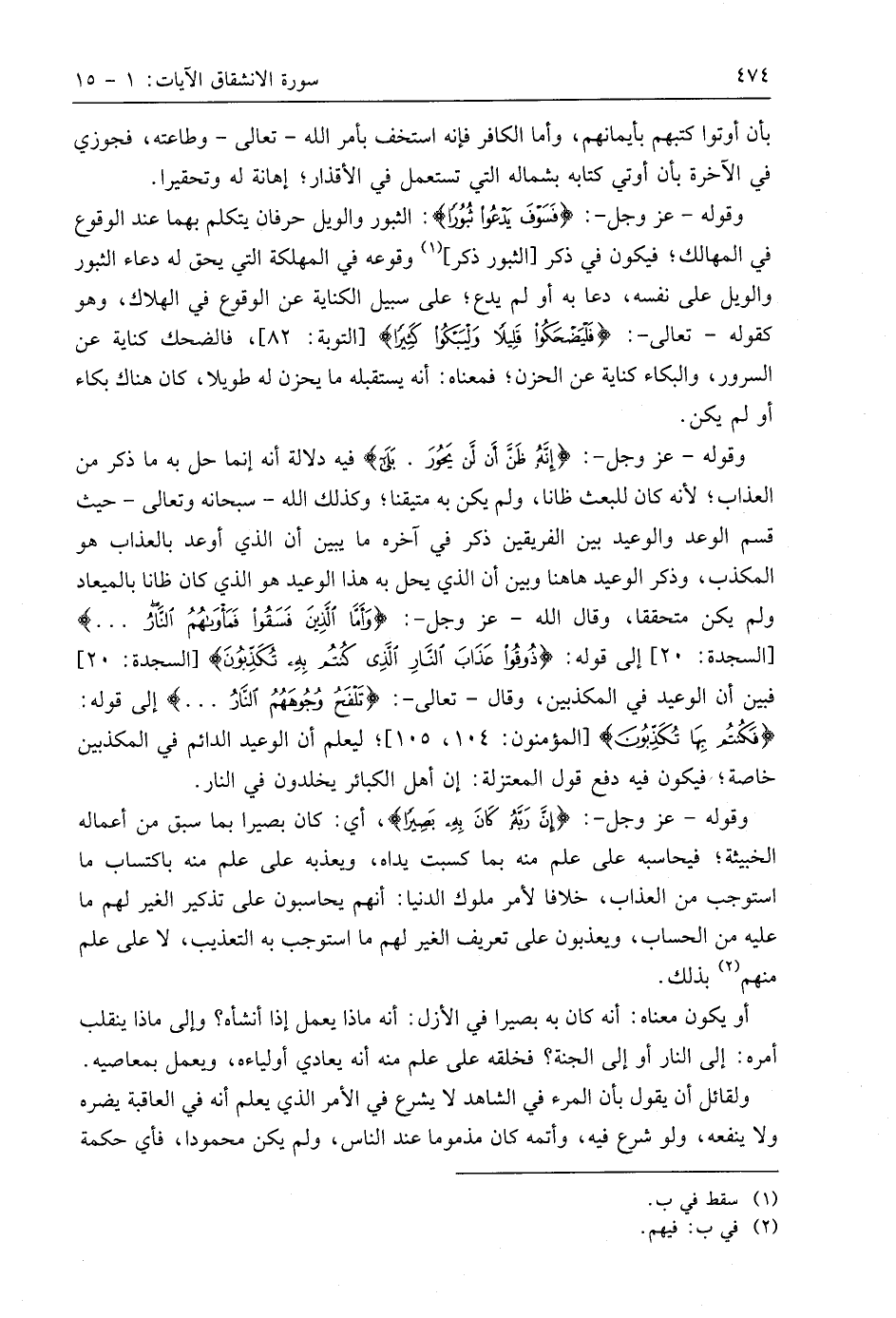 وقوله - عَزَّ وَجَلَّ -: (فَسَوْفَ يَدْعُو ثُبُورًا (11) الثبور والويل حرفان يتكلم بهما عند الوقوع في المهالك؛ فيكون في ذكر الثبور ذكر وقوعه في المهلكة التي يحق له دعاء الثبور والويل على نفسه، دعا به أو لم يدع؛ على سبيل الكناية عن الوقوع في الهلاك، وهو كقوله - تعالى -: (فَلْيَضْحَكُوا قَلِيلًا وَلْيَبْكُوا كَثِيرًا)، فالضحك كناية عن السرور، والبكاء كناية عن الحزن؛ فمعناه: أنه يستقبله ما يحزن له طويلا، كان هناك بكاء أو لم يكن.