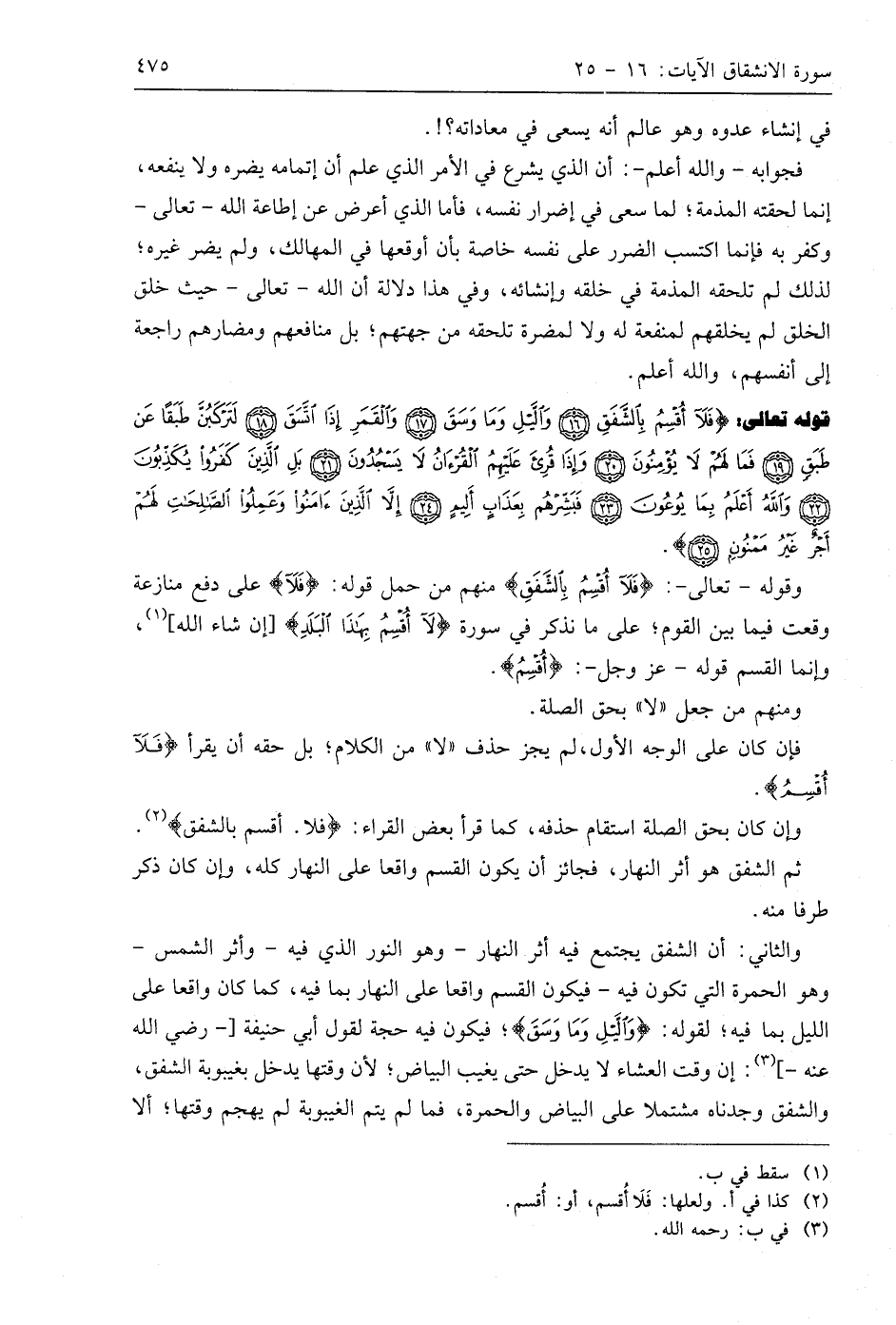 وقوله - تعالى -: (فَلَا أُقْسِمُ بِالشَّفَقِ) منهم من حمل قوله: (فَلَا) على دفع منازعة وقعت فيما بين القوم؛ على ما نذكر في سورة (لَا أُقْسِمُ بِهَذَا الْبَلَدِ) إن شاء اللَّه، وإنما القسم قوله - عَزَّ وَجَلَّ -: (أُقْسِمُ).