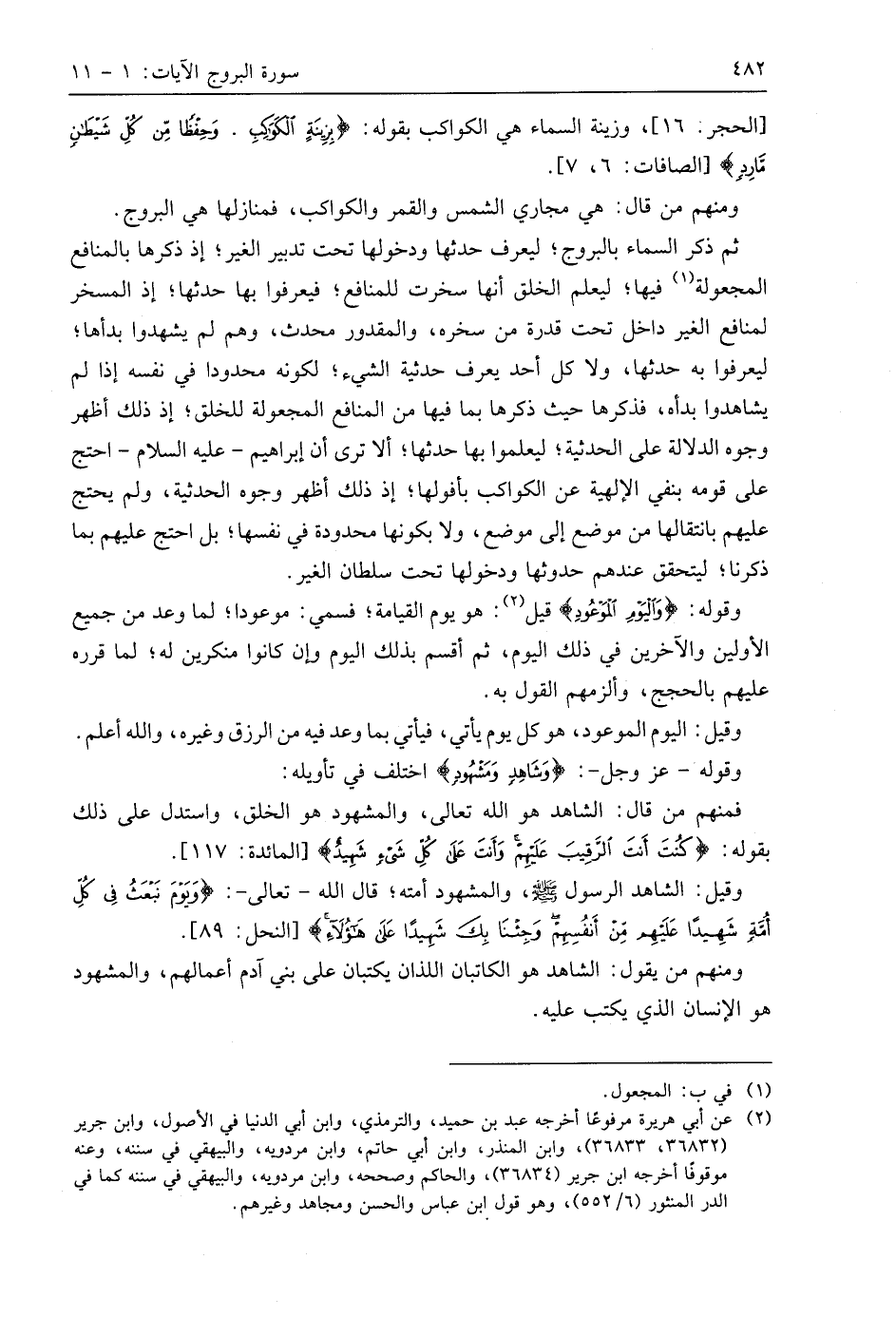 وقوله: (وَالْيَوْمِ الْمَوْعُودِ (2) قيل: هو يوم القيامة؛ فسمي: موعودا؛ لما وعد من جميع الأولين والآخرين في ذلك اليوم، ثم أقسم بذلك اليوم وإن كانوا منكرين له؛ لما قرره عليهم بالحجج، وألزمهم القول به.