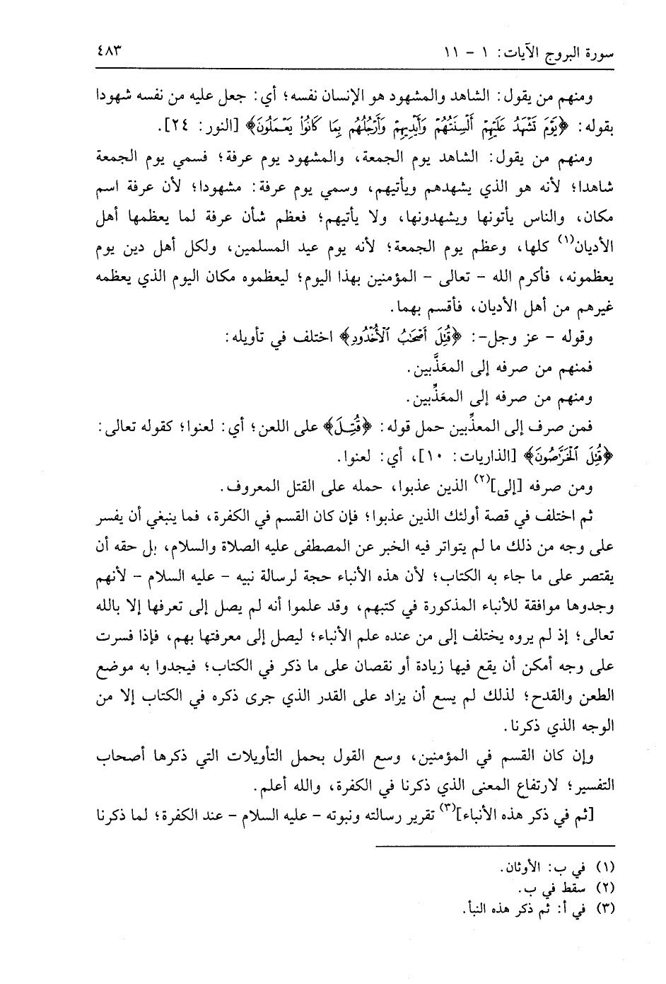 ثم اختلف في قصة أُولَئِكَ الذين عذبوا؛ فإن كان القسم في الكفرة، فما ينبغي أن يفسر على وجه من ذلك ما لم يتواتر فيه الخبر عن المصطفى عليه الصلاة والسلام، بل حقه أن يقتصر على ما جاء به الكتاب؛ لأن هذه الأنباء حجة لرسالة نبيه - عليه السلام - لأنهم وجدوها مواققة للأنباء المذكورة في كتبهم، وقد علموا أنه لم يصل إلى تعرفها إلا بالله تعالى؛ إذ لم يروه يختلف إلى من عنده علم الأنباء؛ ليصل إلى معرفتها بهم، فإذا فسرت على وجه أمكن أن يقع فيها زيادة أو نقصان على ما ذكر في الكتاب؛ فيجدوا به موضع الطعن والقدح؛ لذلك لم يسع أن يزاد على القدر الذي جرى ذكره في الكتاب إلا من الوجه الذي ذكرنا.