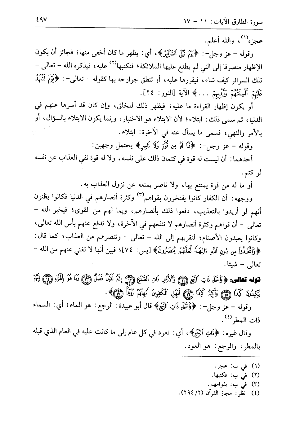 وقوله - عَزَّ وَجَلَّ -: (وَالسَّمَاءِ ذَاتِ الرَّجْعِ) قال أبو عبيدة: الرجع: هو الماء؛ أي: السماء ذات المطر.