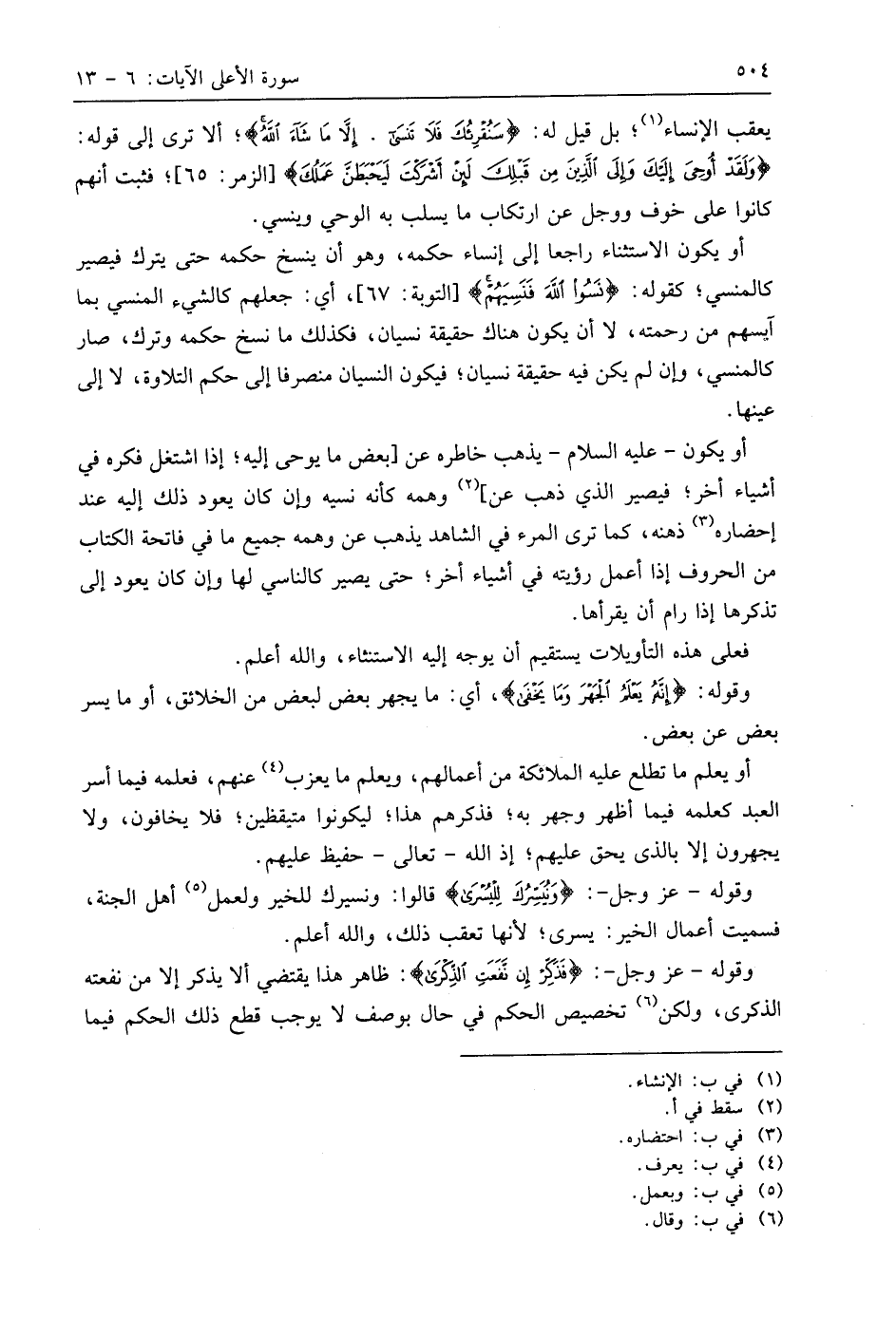 أو يكون - عليه السلام - يذهب خاطره عن بعض ما يوحى إليه؛ إذا اشتغل فكره في أشياء أخر؛ فيصير الذي ذهب عن وهمه كأنه نسيه وإن كان يعود ذلك إليه عند إحضاره ذهنه، كما ترى المرء في الشاهد يذهب عن وهمه جميع ما في فاتحة الكتاب من الحروف إذا أعمل رؤيته في أشياء أخر؛ حتى يصير كالناسي لها وإنْ كان يعود إلى تذكرها إذا رام أن يقرأها.