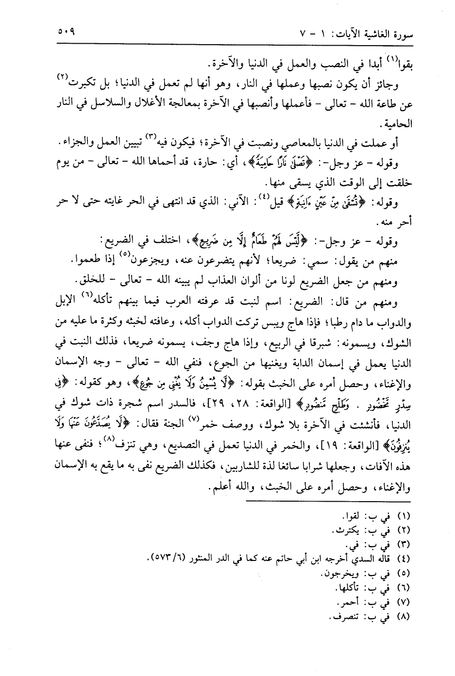 ومنهم من قال: الضريع: اسم لنبت قد عرفته العرب فيما بينهم تأكله الإبل والدواب ما دام رطبا؛ فإذا هاج ويبس تركت الدواب أكله، وعافته لخبثه وكثرة ما عليه من الشوك، ويسمونه: شبرقا في الربيع، وإذا هاج وجف، يسمونه ضريعا، فذلك النبت في الدنيا يعمل في إسمان الدابة ويغنيها من الجوع، فنفي اللَّه - تعالى - وجه الإسمان والإغناء، وحصل أمره على الخبث بقوله: (لَا يُسْمِنُ وَلَا يُغْنِي مِنْ جُوعٍ (7)، وهو كقوله: (فِي سِدْرٍ مَخْضُودٍ. وَطَلْحٍ مَنْضُودٍ)، فالسدر اسم شجرة ذات شوك في الدنيا، فأنشئت في الآخرة بلا شوك، ووصف خمر الجنة فقال: (لَا يُصَدَّعُونَ عَنْهَا وَلَا يُنْزِفُونَ)، والخمر في الدنيا تعمل في التصديع، وهي تنزف؛ فنفى عنها هذه الآفات، وجعلها شرابا سائغا لذة للشاربين، فكذلك الضريع نفى به ما يقع به الإسمان والإغناء، وحصل أمره على الخبث، واللَّه أعلم.