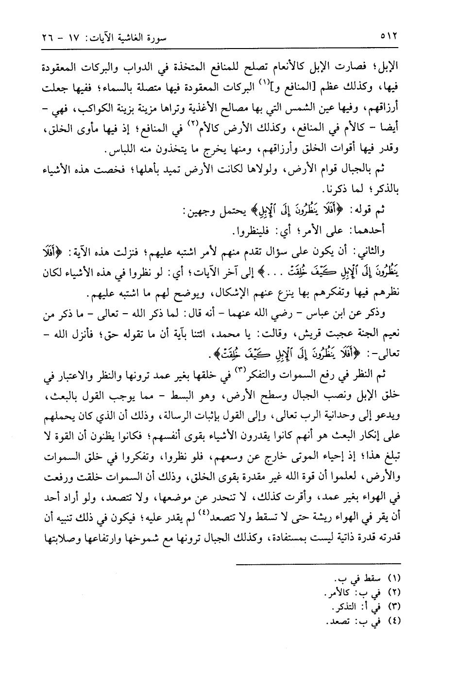 ثم قوله: (أَفَلَا يَنْظُرُونَ إِلَى الْإِبِلِ) يحتمل وجهين: