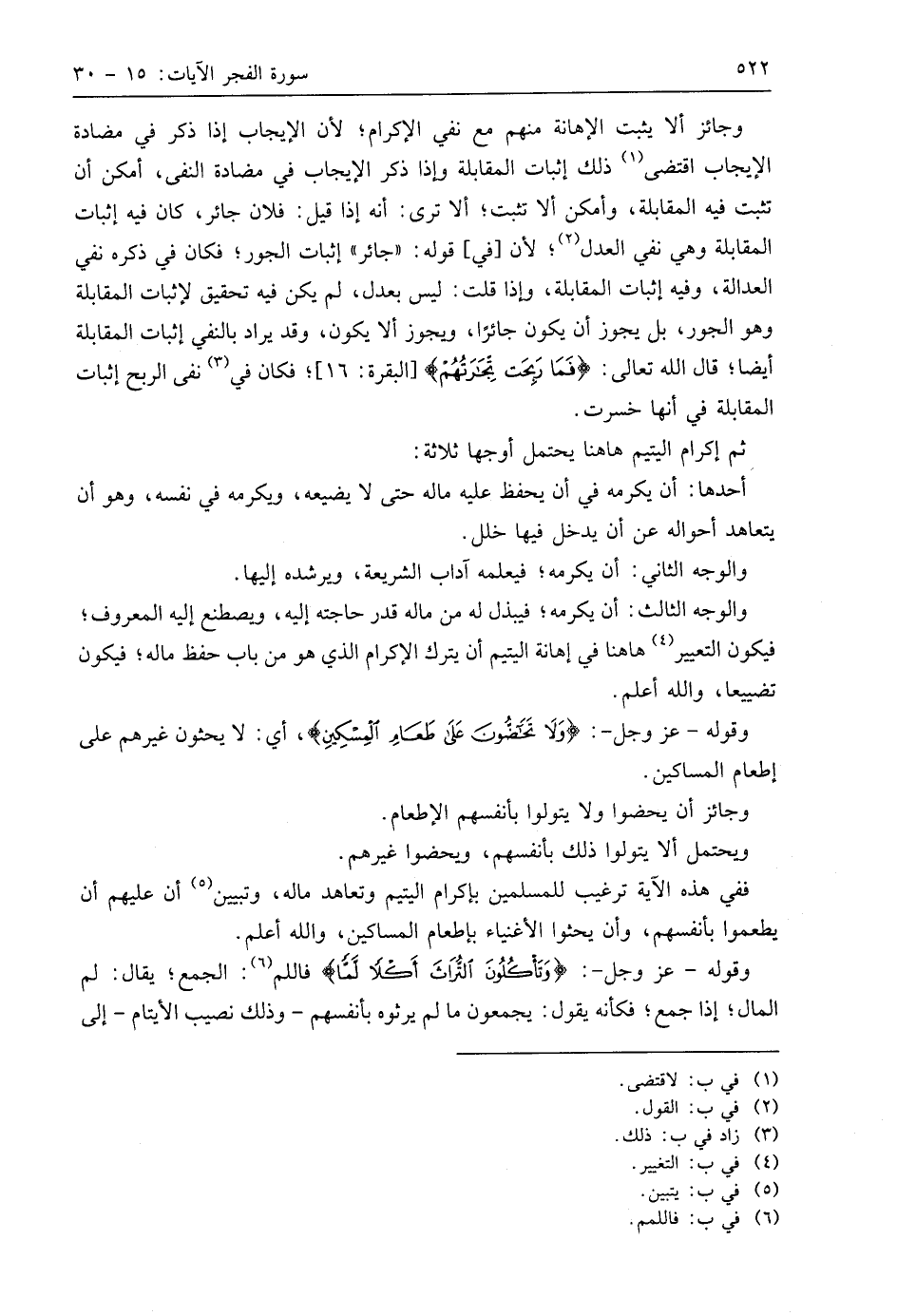 وجائز ألا يثبت الإهانة منهم مع نفي الإكرام؛ لأن الإيجاب إذا ذكر في مضادة الإيجاب اقتضى ذلك إثبات المقابلة وإذا ذكر الإيجاب في مضادة النفي، أمكن أن تثبت فيه المقابلة، وأمكن ألا تثبت؛ ألا ترى: أنه إذا قيل: فلان جائر، كان فيه إثبات المقابلة وهي نفي العدل؛ لأن في قوله: " جائر " إثبات الجور؛ فكان في ذكره نفي العدالة، وفيه إثبات المقابلة، وإذا قلت: ليس بعدل، لم يكن فيه تحقيق لإثبات المقابلة وهو الجور، بل يجوز أن يكون جائرًا، ويجوز ألا يكون، وقد يراد بالنفي إثبات المقابلة أيضا؛ قال اللَّه تعالى: (فَمَا رَبِحَتْ تِجَارَتُهُمْ)؛ فكان في نفى الربح إثبات المقابلة في أنها خسرت.