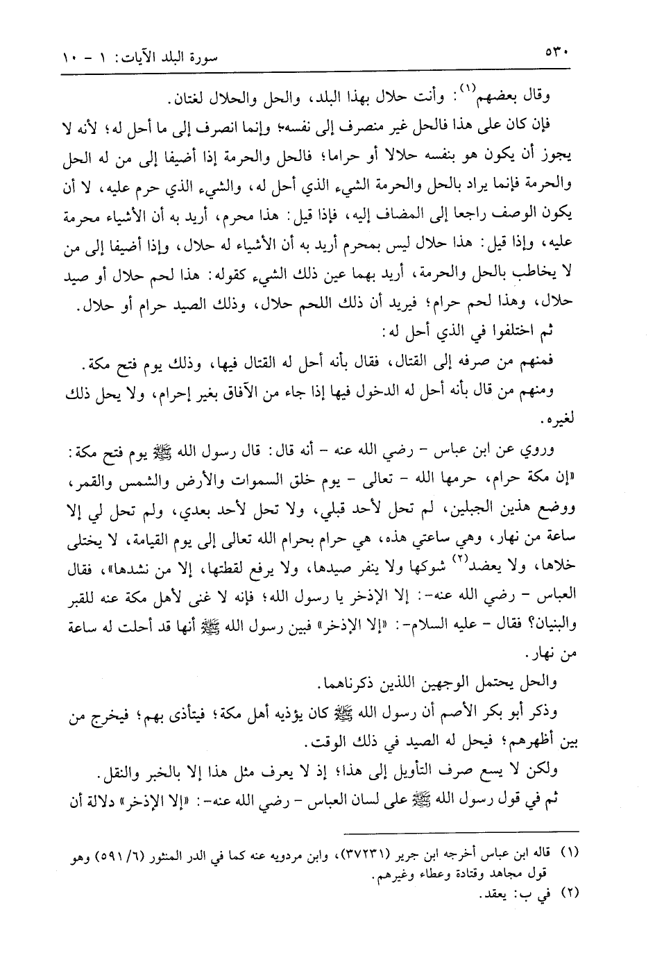 " إن مكة حرام، حرمها اللَّه - تعالى - يوم خلق السماوات والأرض والشمس والقمر، ووضع هذين الجبلين، لم تحل لأحد قبلي، ولا تحل لأحد بعدي، ولم تحل لي إلا ساعة من نهار، وهي ساعتي هذه، هي حرام بحرام اللَّه تعالى إلى يوم القيامة، لا يختلى خلاها، ولا يعضد شوكها ولا ينفر صيدها، ولا يرفع لقطتها، إلا من نشدها "، فقال العباس - رَضِيَ اللَّهُ عَنْهُ -: إلا الإذخر يا رسول اللَّه؛ فإنه لا غنى لأهل مكة عنه للقبر والبنيان؟ فقال - عليه السلام -: " إلا الإذخر " فبين رسول اللَّه - صَلَّى اللَّهُ عَلَيهِ وَسَلَّمَ - أنها قد أحلت له ساعة من نهار.