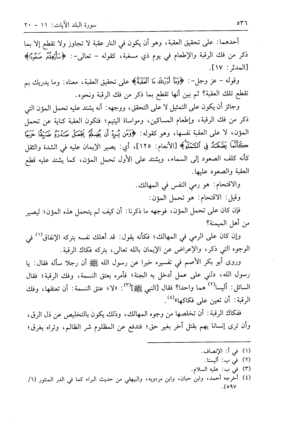 وروى أبو بكر الأصم في تفسيره خبرا عن رسول اللَّه - صَلَّى اللَّهُ عَلَيهِ وَسَلَّمَ - أن رجلا سأله فقال: يا رسول اللَّه، دلني على عمل أدخل به الجنة؟ فأمره بعتق النسمة، وفك الرقبة؛ فقال السائل: أليسا هما واحدا؟ فقال النبي - صَلَّى اللَّهُ عَلَيهِ وَسَلَّمَ -: " لا؛ عتق النسمة: أن تعتقها، وفك الرقبة: أن تعين على فكاكها ".