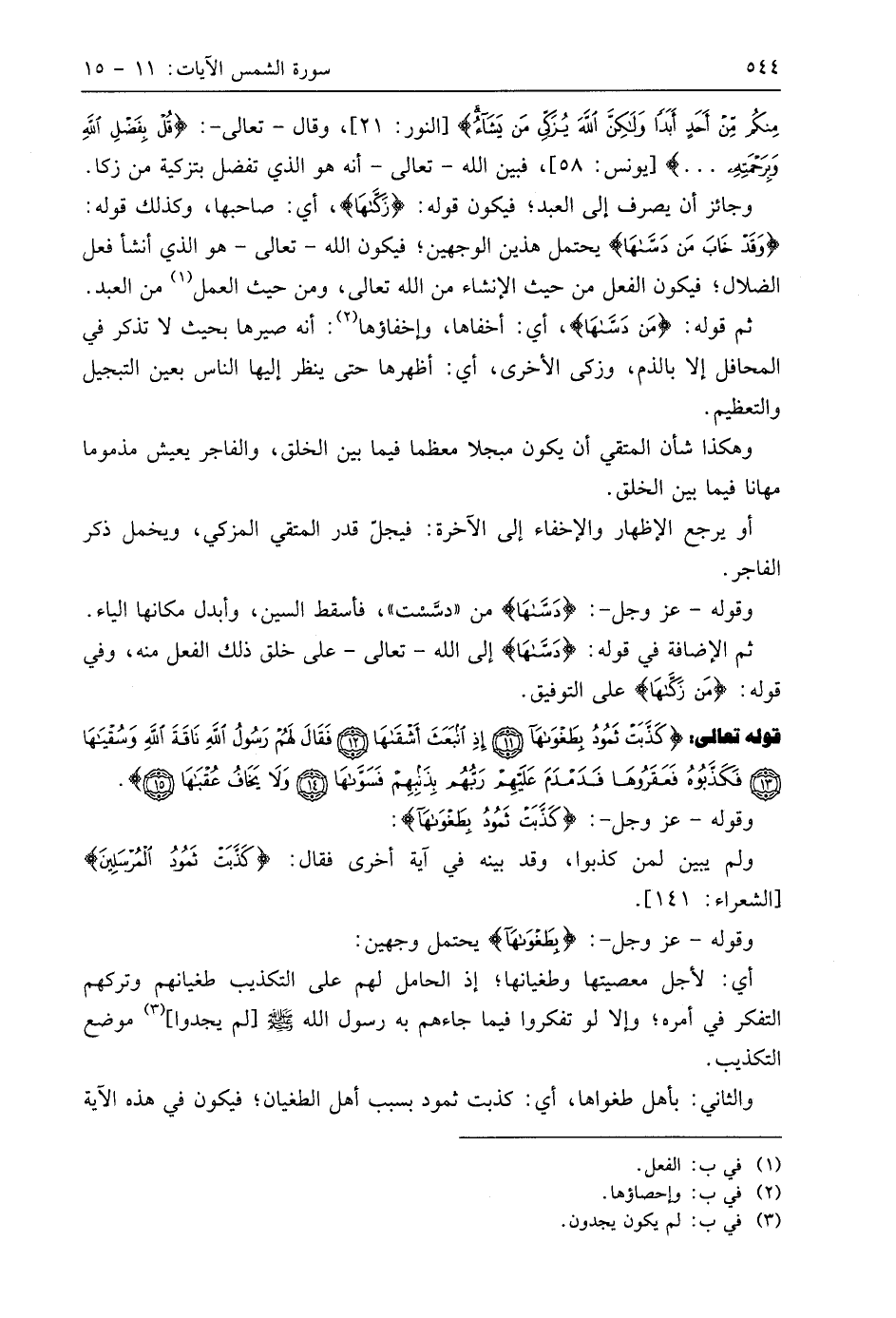 وجائز أن يصرف إلى العبد؛ فيكون قوله: (زَكَّاهَا)، أي: صاحبها، وكذلك قوله: (وَقَدْ خَابَ مَنْ دَسَّاهَا) يحتمل هذين الوجهين؛ فيكون اللَّه - تعالى - هو الذي أنشأ فعل الضلال؛ فيكون الفعل من حيث الإنشاء من اللَّه تعالى، ومن حيث العمل من العبد.