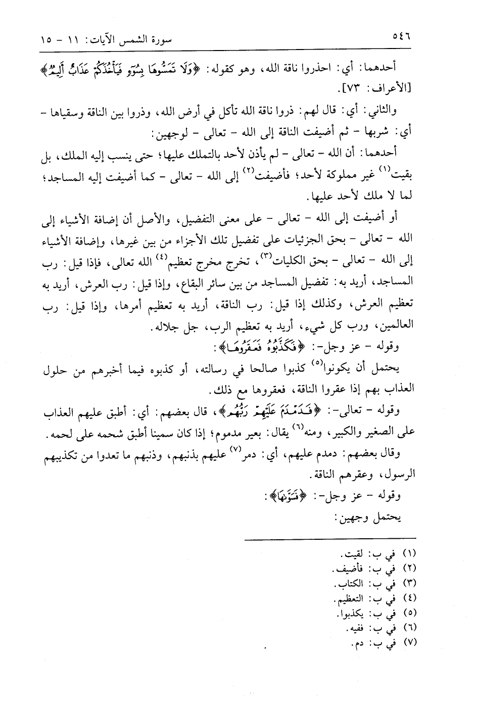 والثاني: أي: قال لهم: ذروا ناقة اللَّه تأكل في أرض اللَّه، وذروا بين الناقة وسقياها -أي: شربها- ثم أضيفت الناقة إلى اللَّه - تعالى - لوجهين:
