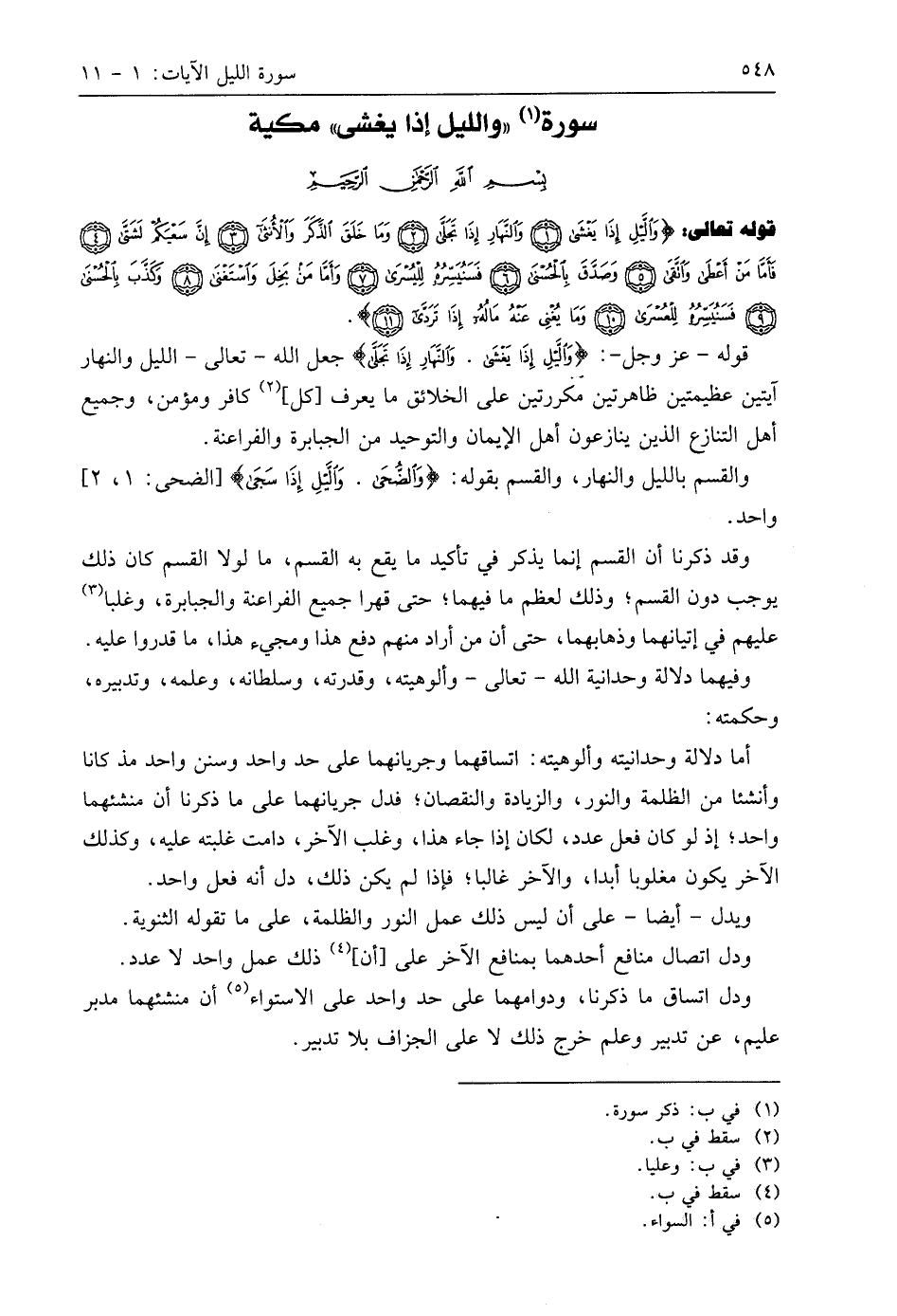 قوله - عَزَّ وَجَلَّ -: (وَاللَّيْلِ إِذَا يَغْشَى (1) وَالنَّهَارِ إِذَا تَجَلَّى) جعل اللَّه - تعالى - الليل والنهار آيتين عظيمتين ظاهرتين مكررتين على الخلائق ما يعرف كل كافر ومؤمن، وجميع أهل التنازع الذين ينازعون أهل الإيمان والتوحيد من الجبابرة والفراعنة.