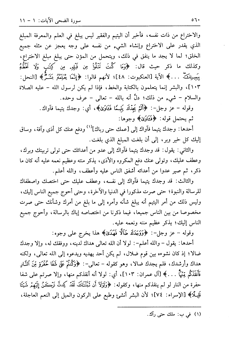 والثالث: قد وجدك يتيما فآواك إلى نفسه، وعطف عليك حتى اختصك واصطفاك للرسالة والنبوة؛ حتى صرت مذكورا في الدنيا والآخرة، وحتى أحوج جميع الناس إليك، وليس ذلك من أمر اليتيم أنه يبلغ شأنه وأمره إلى ما بلغ من أمرك وشأنك حتى صرت مخصوصا من بين الناس جميعا، فيما ذكرنا من اختصاصه إياك بالرسالة، وأحوج جميع الناس إليك؛ يذكر عظيم مننه ونعمه عليه.