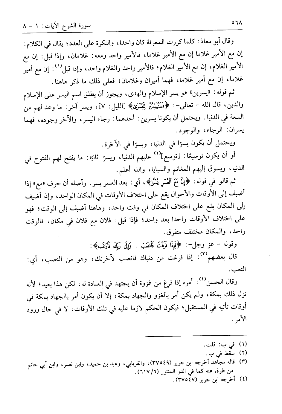 ثم قالوا في قوله: (إِنَّ مَعَ الْعُسْرِ يُسْرًا)، أي: بعد العسر يسر. وأصله أن حرف " مع " إذا أضيف إلى الأوقات والأحوال يقع على اختلاف الأوقات في المكان الواحد، وإذا أضيف إلى المكان يقع على اختلاف المكان في وقت واحد، وهاهنا أضيف إلى الوقت؛ فهو على اختلاف الأوقات واحدا بعد واحد؛ فإذا قيل: فلان مع فلان في مكان، فالوقت واحد، والمكان مختلف متفرق.