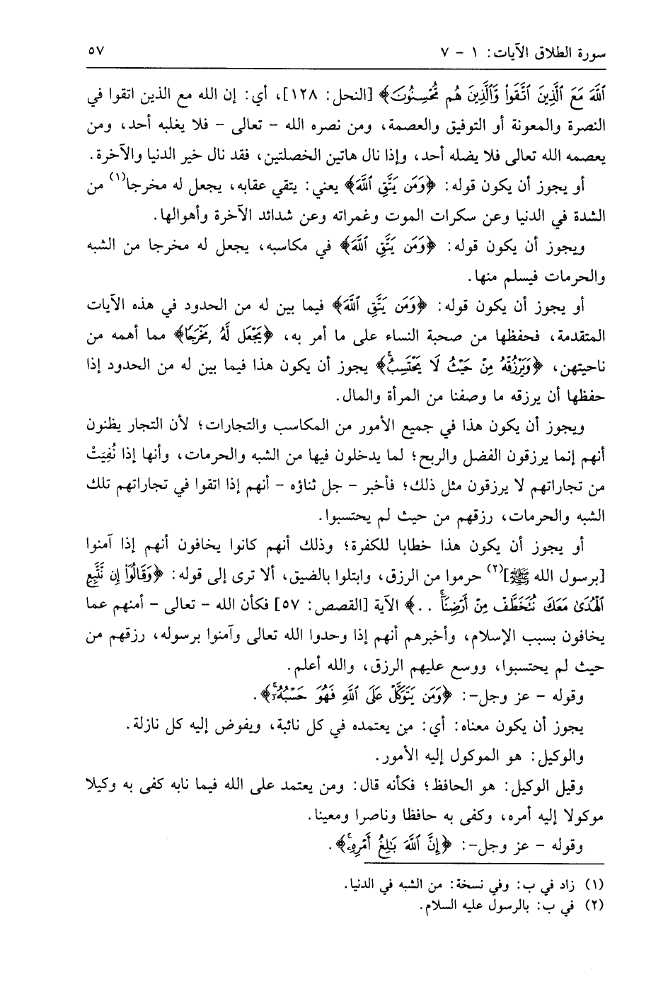 أو يجوز أن يكون قوله: (وَمَنْ يَتَّقِ اللَّهَ) فيما بين له من الحدود في هذه الآيات المتقدمة، فحفظها من صحبة النساء على ما أمر به، (يَجْعَلْ لَهُ مَخْرَجًا) مما أهمه من ناحيتهن، (وَيَرْزُقْهُ مِنْ حَيْثُ لَا يَحْتَسِبُ ... (3) يجوز أن يكون هذا فيما بين له من الحدود إذا حفظها أن يرزقه ما وصفنا من المرأة والمال.