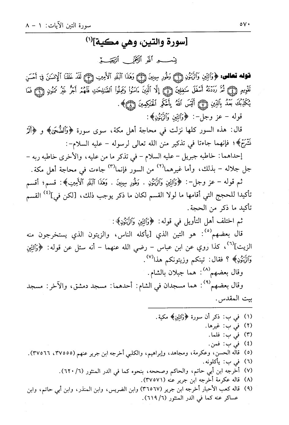 ثم قوله - عَزَّ وَجَلَّ -: (وَالتِّينِ وَالزَّيْتُونِ (1) وَطُورِ سِينِينَ (2) وَهَذَا الْبَلَدِ الْأَمِينِ): قسم؛ أقسم تأكيدا للحجج التي أقامها ما لولا القسم لكان ما ذكر يوجب ذلك، لكن في القسم تأكيد ما ذكر من الحجة.
