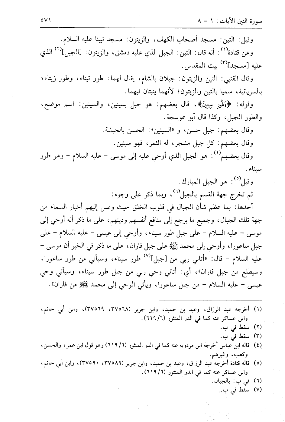 وقَالَ الْقُتَبِيُّ: التين والزيتون: جبلان بالشام، يقال لهما: طور تيناء، وطور زيتاء؛ بالسريانية، سميا بالتين والزيتون؛ لأنهما ينبتان فيهما.