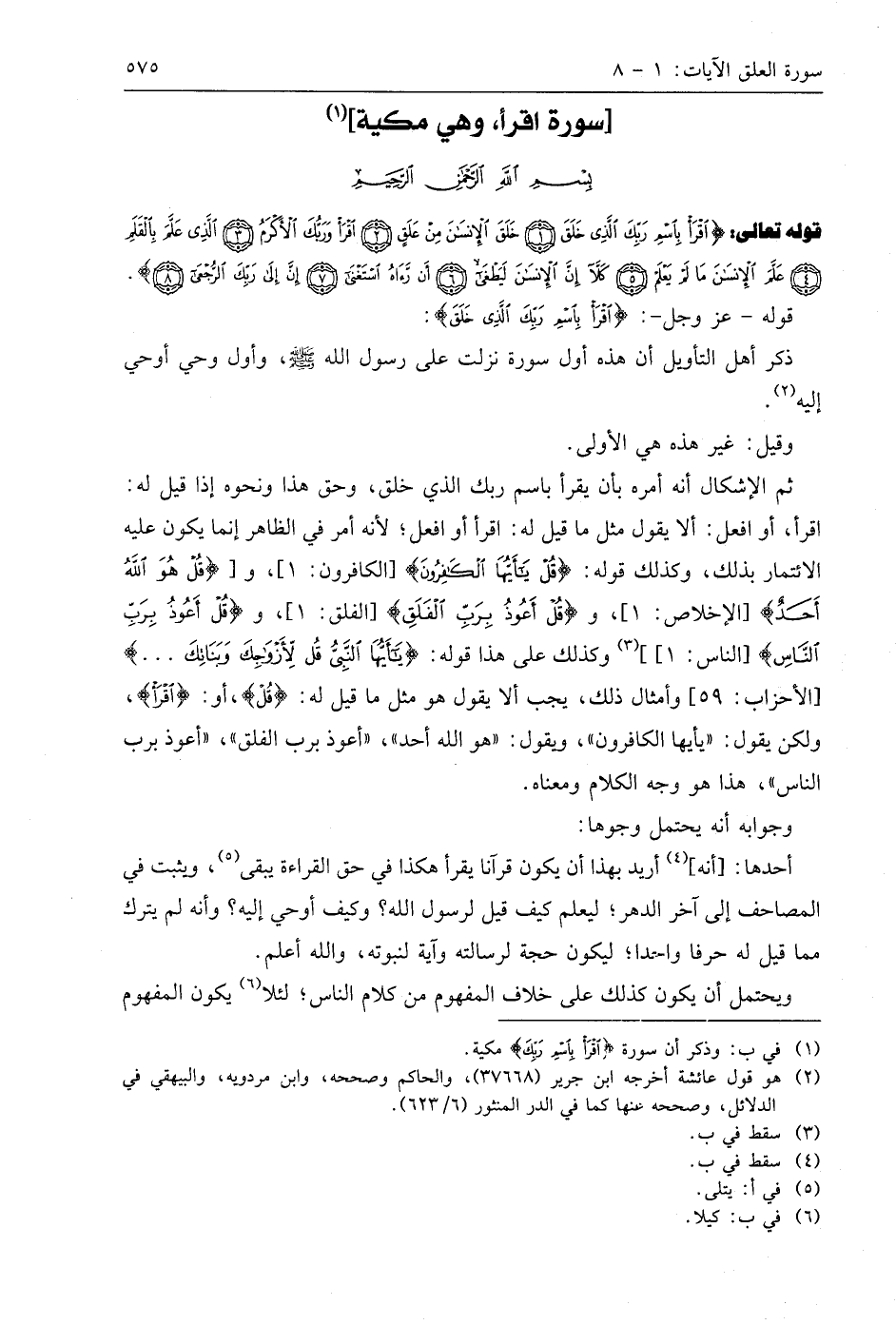 قوله تعالى: (اقْرَأْ بِاسْمِ رَبِّكَ الَّذِي خَلَقَ (1) خَلَقَ الْإِنْسَانَ مِنْ عَلَقٍ (2) اقْرَأْ وَرَبُّكَ الْأَكْرَمُ (3) الَّذِي عَلَّمَ بِالْقَلَمِ (4) عَلَّمَ الْإِنْسَانَ مَا لَمْ يَعْلَمْ (5) كَلَّا إِنَّ الْإِنْسَانَ لَيَطْغَى (6) أَنْ رَآهُ اسْتَغْنَى (7) إِنَّ إِلَى رَبِّكَ الرُّجْعَى (8).