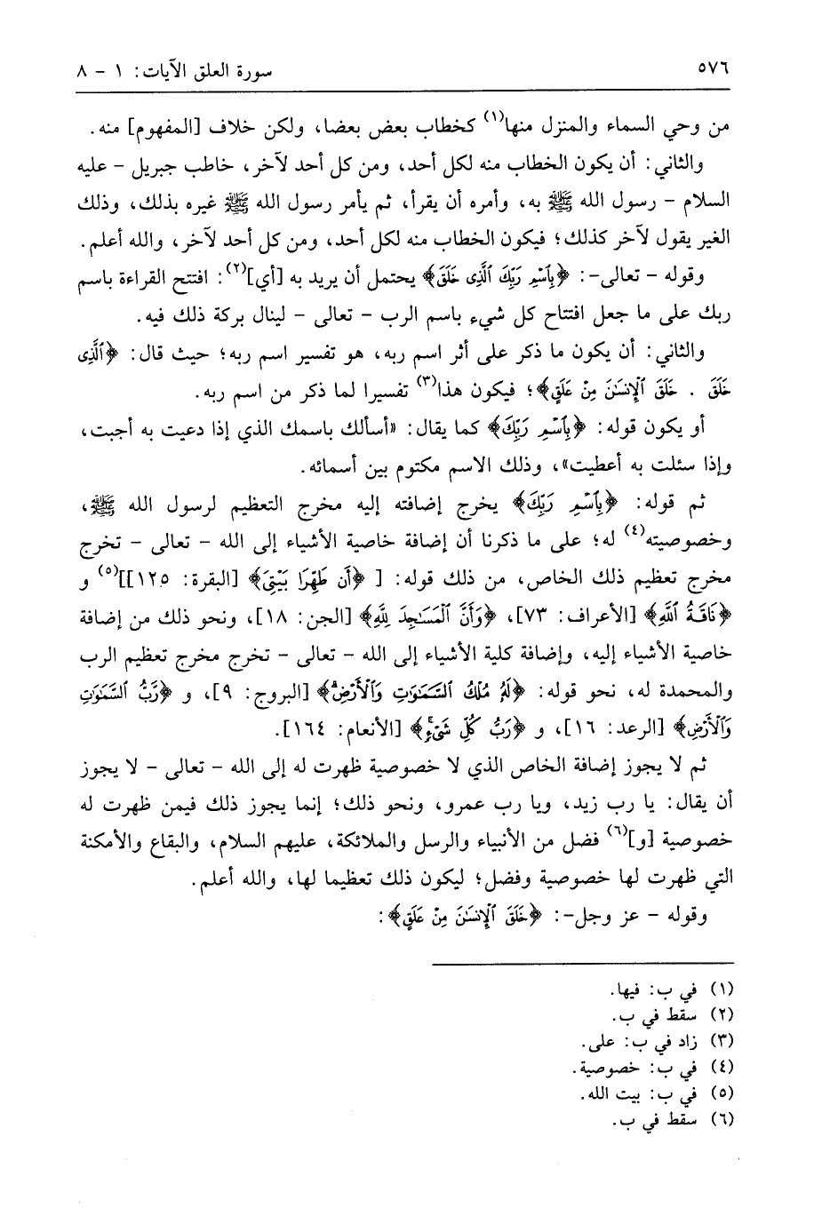 ثم قوله: (بِاسْمِ رَبِّكَ) يخرج إضافته إليه مخرج التعظيم لرسول اللَّه - صَلَّى اللَّهُ عَلَيهِ وَسَلَّمَ -، وخصوصيته له؛ على ما ذكرنا أن إضافة خاصية الأشياء إلى اللَّه - تعالى - تخرج مخرج تعظيم ذلك الخاص، من ذلك قوله: (أَنْ طَهِّرَا بَيْتِيَ)، و (نَاقَةُ اللَّهِ)، (وَأَنَّ الْمَسَاجِدَ لِلَّهِ)، ونحو ذلك من إضافة خاصية الأشياء إليه، وإضافة كلية الأشياء إلى اللَّه - تعالى - تخرج مخرج تعظيم الرب والمحمدة له، نحو قوله: (لَهُ مُلْكُ السَّمَاوَاتِ وَالْأَرْضِ)، و (رَبُّ السَّمَاوَاتِ وَالْأَرْضِ)، و (رَبُّ كُلِّ شَيْءٍ).