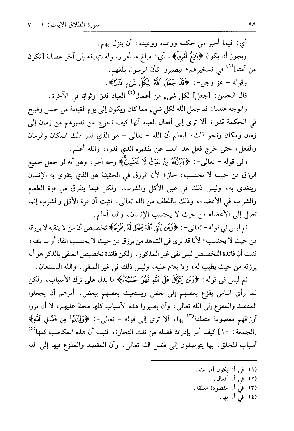 ثم ليس في قوله: (وَمَنْ يَتَوَكَّلْ عَلَى اللَّهِ فَهُوَ حَسْبُهُ) ما يدل على ترك الأسباب، ولكن لما رأى الناس يفزع بعضهم إلى بعض ويستغيث بعضهم ببعض، أمرهم أن يجعلوا المقصد والمفزع إلى اللَّه تعالى، وأن يصيروا هذه الأسباب كلها محنة عليهم، لا أن يروا أرزاقهم معصومة متعلقة بها، ألا ترى إلى قوله - تعالى -: (وَابْتَغُوا مِنْ فَضْلِ اللَّهِ) كيف أمر بإدراك فضله من تلك التجارة؛ فثبت أن هذه المكاسب كلها أسباب للخلق، بها يتوصلون إلى فضل اللَّه تعالى، وأن المقصد والمفزع فيها إلى الله