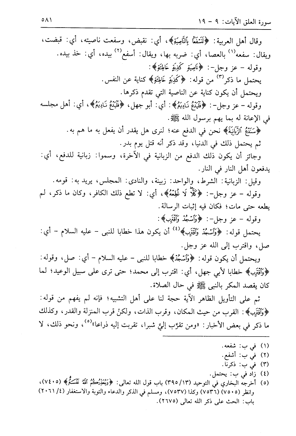 ثم على التأويل الظاهر الآية حجة لنا على أهل التشبيه؛ فإنه لم يفهم من قوله: (وَاقْتَرِبْ): القرب من حيث المكان، وقرب الذات، ولكنْ قرب المنزلة والقدر، وكذلك ما ذكر في بعض الأخبار: " ومن تقرَّب إليَّ شبرا، تقربت إليه ذراعا "، ونحو ذلك، لا