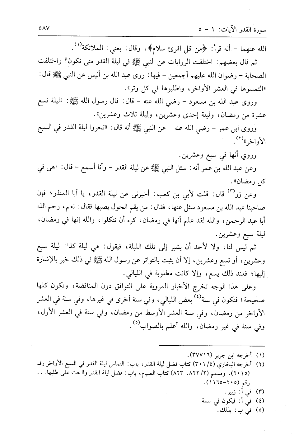 ثم قَالَ بَعْضُهُمْ: اختلفت الروايات عن النبي - صَلَّى اللَّهُ عَلَيهِ وَسَلَّمَ - في ليلة القدر متى تكون؟ واختلفت الصحابة - رضوان اللَّه عليهم أجمعين - فيها: روى عبد اللَّه بن أنيس عن النبي - صَلَّى اللَّهُ عَلَيهِ وَسَلَّمَ - قال: " التمسوها في العشر الأواخر، واطلبوها في كل وتر ".
