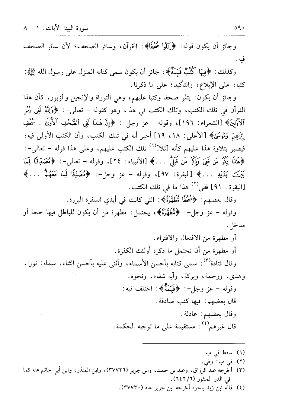 وجائز أن يكون قوله: (يَتْلُو صُحُفًا): القرآن، وسائر الصحف؛ لأن سائر الصحف فيه.