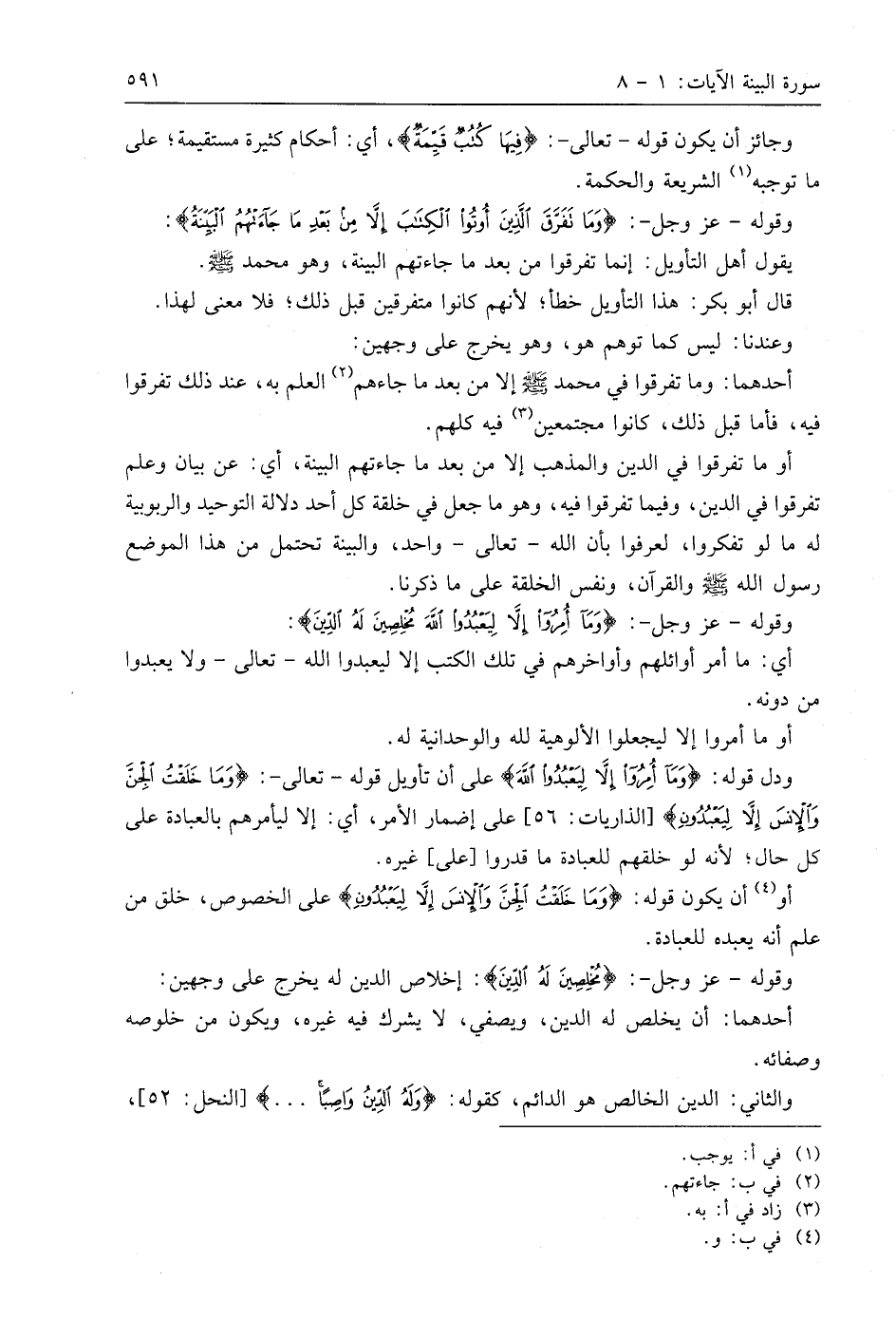 أو ما تفرقوا في الدِّين والمذهب إلا من بعد ما جاءتهم البينة، أي: عن بيان وعلم تفرقوا في الدِّين، وفيما تفرقوا فيه، وهو ما جعل في خلقة كل أحد دلالة التوحيد والربوبية له ما لو تفكروا، لعرفوا بأن اللَّه - تعالى - واحد، والبينة تحتمل من هذا الموضع رسول اللَّه - صَلَّى اللَّهُ عَلَيهِ وَسَلَّمَ - والقرآن، ونفس الخلقة على ما ذكرنا.