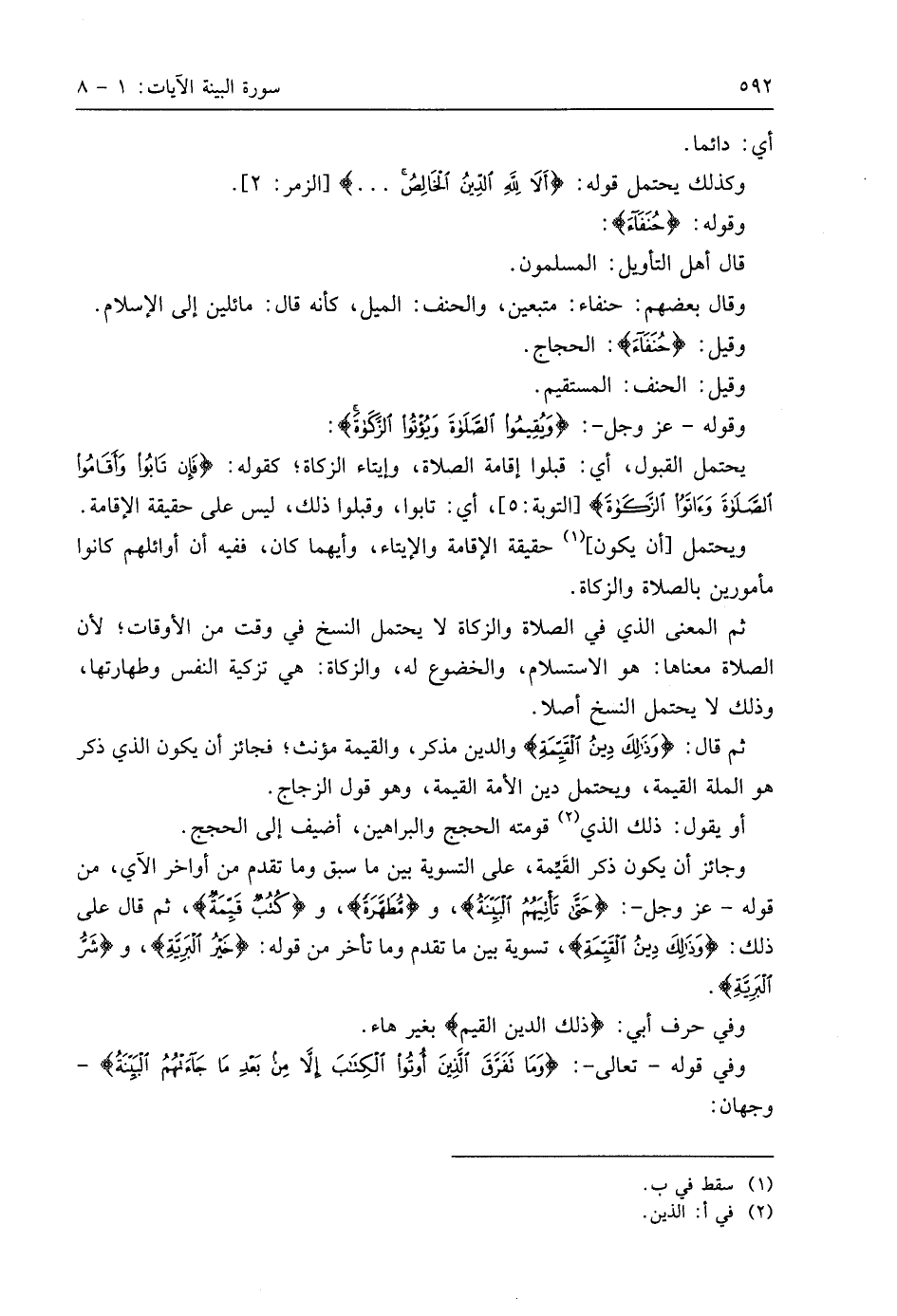 وجائز أن يكون ذكر القَيِّمة، على التسوية بين ما سبق وما تقدم من أواخر الآي، من قوله - عَزَّ وَجَلَّ -: (حَتَّى تَأْتِيَهُمُ الْبَيِّنَةُ)، و (مُطَهَّرَةً)، و (كُتُبٌ قَيِّمَةٌ)، ثم قال على ذلك: (وَذَلِكَ دِينُ الْقَيِّمَةِ)، تسوية بين ما تقدم وما تأخر من قوله: (خَيْرُ الْبَرِيَّةِ)، و (شَرُّ الْبَرِيَّةِ).