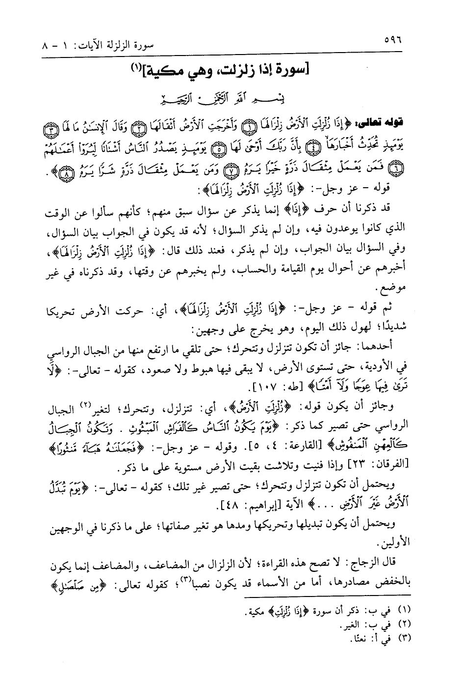 قوله تعالى: (إِذَا زُلْزِلَتِ الْأَرْضُ زِلْزَالَهَا (1) وَأَخْرَجَتِ الْأَرْضُ أَثْقَالَهَا (2) وَقَالَ الْإِنْسَانُ مَا لَهَا (3) يَوْمَئِذٍ تُحَدِّثُ أَخْبَارَهَا (4) بِأَنَّ رَبَّكَ أَوْحَى لَهَا (5) يَوْمَئِذٍ يَصْدُرُ النَّاسُ أَشْتَاتًا لِيُرَوْا أَعْمَالَهُمْ (6) فَمَنْ يَعْمَلْ مِثْقَالَ ذَرَّةٍ خَيْرًا يَرَهُ (7) وَمَنْ يَعْمَلْ مِثْقَالَ ذَرَّةٍ شَرًّا يَرَهُ (8).