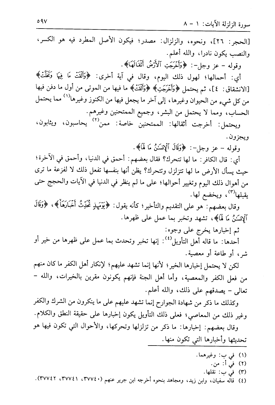 وقَالَ بَعْضُهُمْ: إخبارها: ما ذكر من تزلزلها وتحركها، والأحوال التي تكون فيها هو تحديثها وأخبارها التي تكون منها.