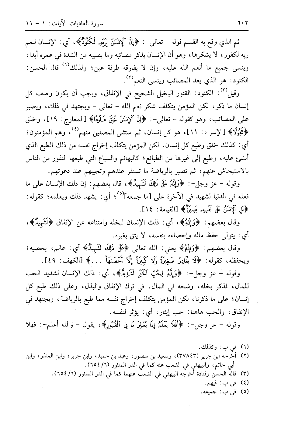 ثم الذي وقع به القسم قوله - تعالى -: (إِنَّ الْإِنْسَانَ لِرَبِّهِ لَكَنُودٌ (6) أي: الإنسان لنعم ربه لكفور، لا يشكرها، وهو أن الإنسان يذكر مصائبه وما يصيبه من الشدة في عمره أبدا، وينسى جميع ما أنعم اللَّه عليه، وإن لا يفارقه طرفة عين؛ ولذلك قال الحسن: الكنود: هو الذي يعد المصائب وينسى النعم.