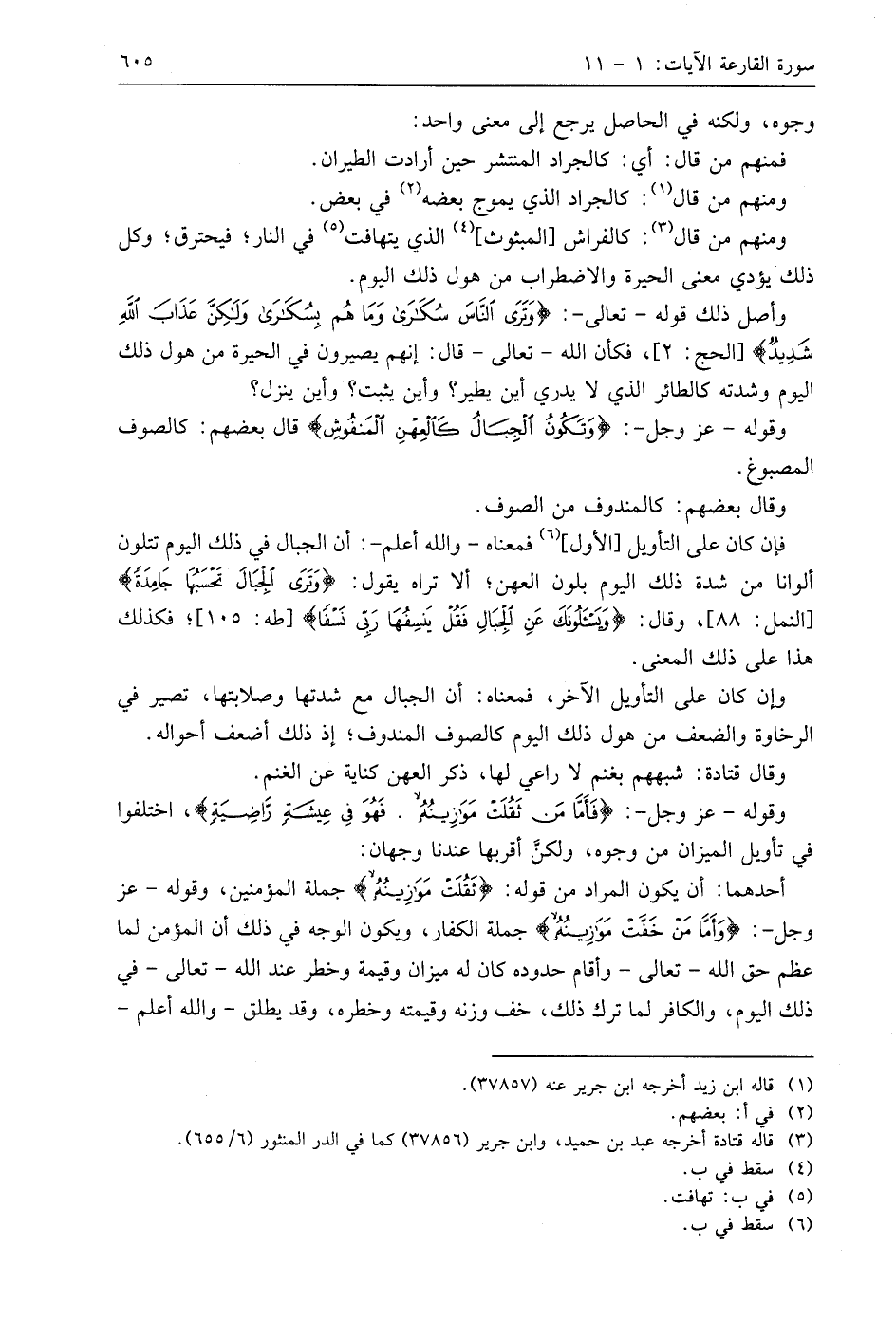 وقوله - عَزَّ وَجَلَّ -: (فَأَمَّا مَنْ ثَقُلَتْ مَوَازِينُهُ (6) فَهُوَ فِي عِيشَةٍ رَاضِيَةٍ (7) اختلفوا في تأويل الميزان من وجوه، ولكنَّ أقربها عندنا وجهان: