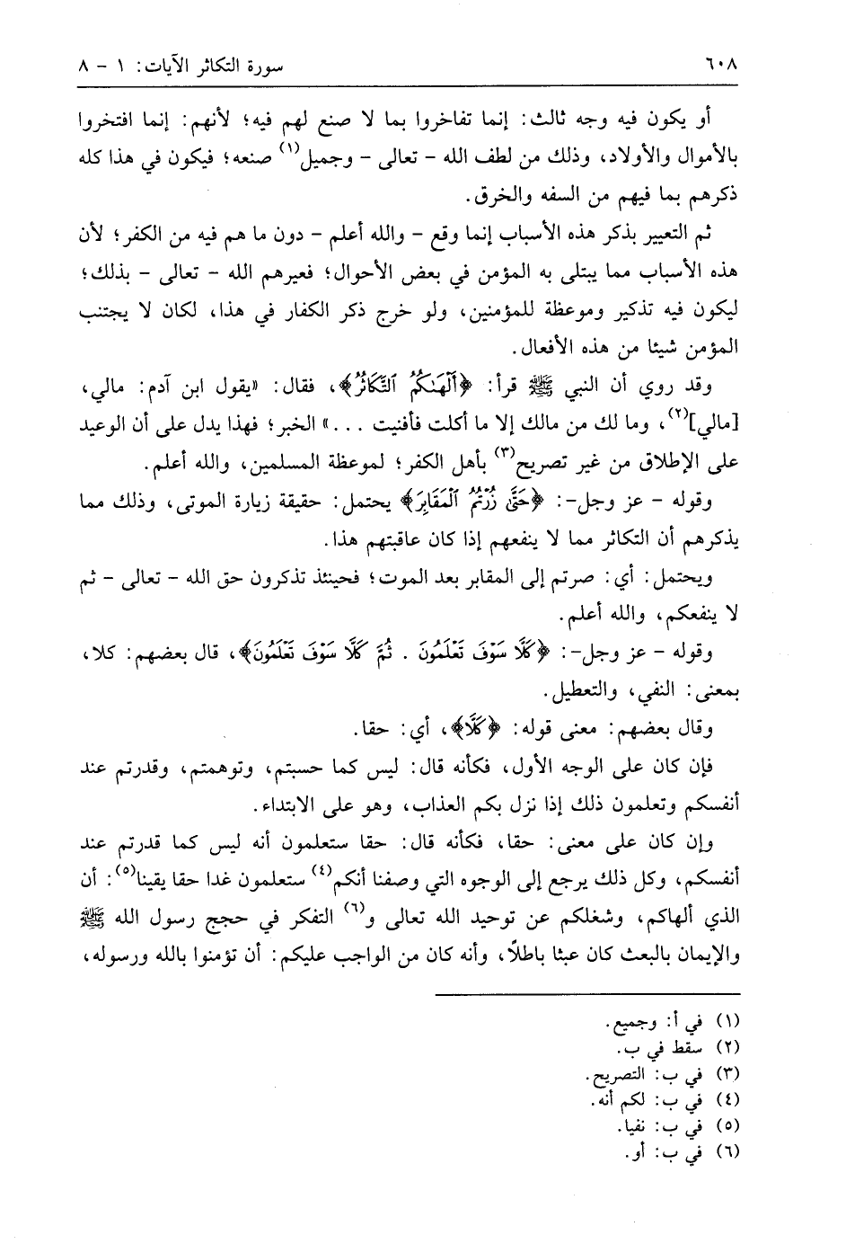 وقد روي أن النبي - صَلَّى اللَّهُ عَلَيهِ وَسَلَّمَ - قرأ: (أَلْهَاكُمُ التَّكَاثُرُ)، فقال: " يقول ابن آدم: مالي، مالي، وما لك من مالك إلا ما أكلت فأفنيت. . . " الخبر؛ فهذا يدل على أن الوعيد على الإطلاق من غير تصريح بأهل الكفر؛ لموعظة المسلمين، واللَّه أعلم.