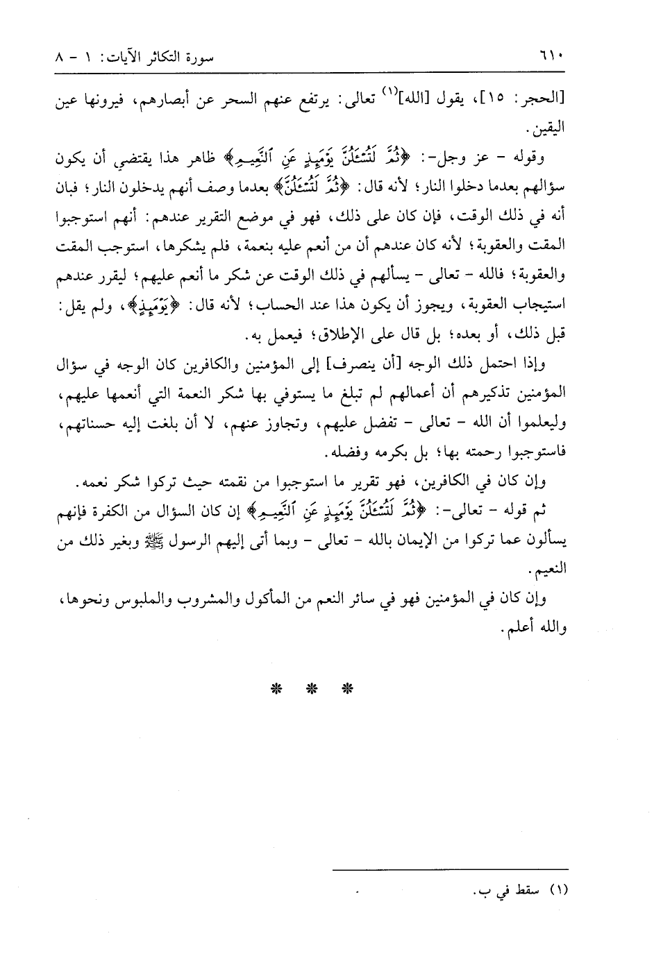 ثم قوله - تعالى -: (ثُمَّ لَتُسْأَلُنَّ يَوْمَئِذٍ عَنِ النَّعِيمِ) إن كان السؤال من الكفرة فإنهم يسألون عما تركوا من الإيمان باللَّه - تعالى - وبما أتى إليهم الرسول - صَلَّى اللَّهُ عَلَيهِ وَسَلَّمَ - وبغير ذلك من النعيم.