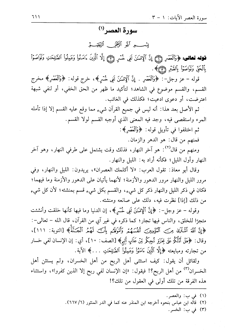 قوله تعالى: (وَالْعَصْرِ (1) إِنَّ الْإِنْسَانَ لَفِي خُسْرٍ. إِلَّا الَّذِينَ آمَنُوا وَعَمِلُوا الصَّالِحَاتِ وَتَوَاصَوْا بِالْحَقِّ وَتَوَاصَوْا بِالصَّبْرِ (3).