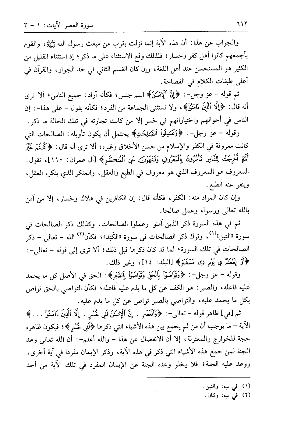 ثم في هذه السورة ذكر الذين آمنوا وعملوا الصالحات، وكذلك ذكر الصالحات في سُورَة " التين "، وترك ذكر الصالحات في سورة " الكَبَد "؛ فكأن اللَّه - تعالى - ذكر الصالحات في تلك السورة؛ لما قد كان ذكرها قبل ذلك؛ ألا ترى إلى قوله - تعالى -: (أَوْ إِطْعَامٌ فِي يَوْمٍ ذِي مَسْغَبَةٍ)، وغير ذلك.