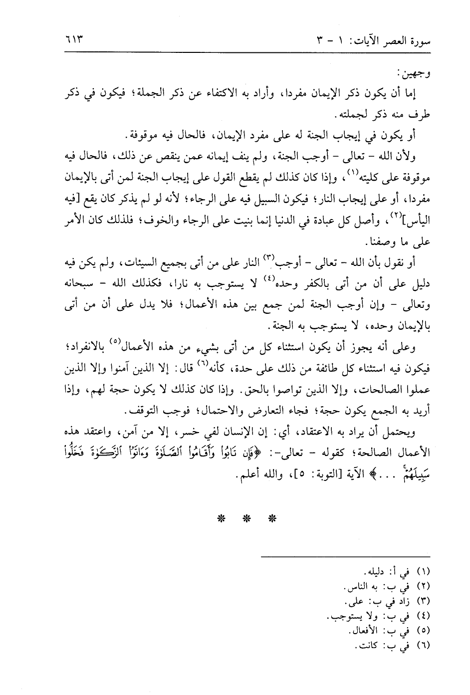 وعلى أنه يجوز أن يكون استثناء كل من أتى بشيء من هذه الأعمال بالانفراد؛ فيكون فيه استثناء كل طائفة من ذلك على حدة، كأنه قال: إلا الذين آمنوا وإلا الذين عملوا الصالحات، وإلا الذين تواصوا بالحق. وإذا كان كذلك لا يكون حجة لهم، وإذا أريد به الجمع يكون حجة؛ فجاء التعارض والاحتمال؛ فوجب التوقف.