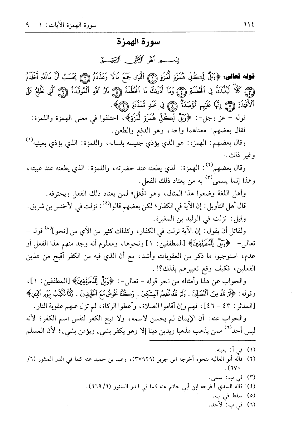 قوله تعالى: (وَيْلٌ لِكُلِّ هُمَزَةٍ لُمَزَةٍ (1) الَّذِي جَمَعَ مَالًا وَعَدَّدَهُ (2) يَحْسَبُ أَنَّ مَالَهُ أَخْلَدَهُ (3) كَلَّا لَيُنْبَذَنَّ فِي الْحُطَمَةِ (4) وَمَا أَدْرَاكَ مَا الْحُطَمَةُ (5) نَارُ اللَّهِ الْمُوقَدَةُ (6) الَّتِي تَطَّلِعُ عَلَى الْأَفْئِدَةِ (7) إِنَّهَا عَلَيْهِمْ مُؤْصَدَةٌ (8) فِي عَمَدٍ مُمَدَّدَةٍ (9).