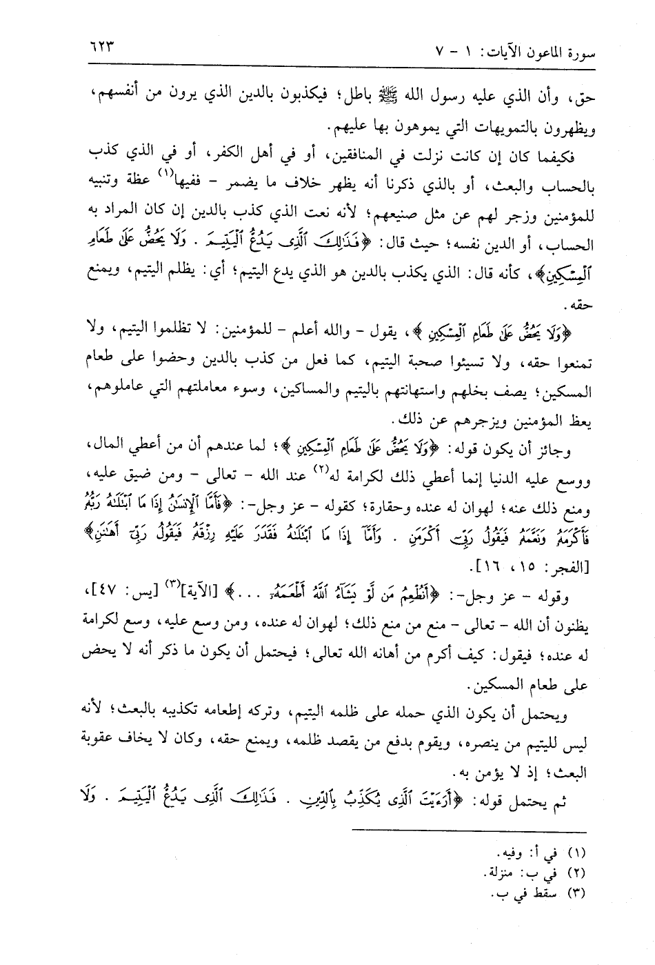 فكيفما كان إن كانت نزلت في المنافقين، أو في أهل الكفر، أو في الذي كذب بالحساب والبعث، أو بالذي ذكرنا أنه يظهر خلاف ما يضمر - ففيها عظة وتنبيه للمؤمنين وزجر لهم عن مثل صنيعهم؛ لأنه نعت الذي كذب بالدِّين إن كان المراد به الحساب، أو الدِّين نفسه؛ حيث قال: (فَذَلِكَ الَّذِي يَدُعُّ الْيَتِيمَ (2) وَلَا يَحُضُّ عَلَى طَعَامِ الْمِسْكِينِ) كأنه قال: الذي يكذب بالدِّين هو الذي يدع اليتيم؛ أي: يظلم اليتيم، ويمنع حقه.