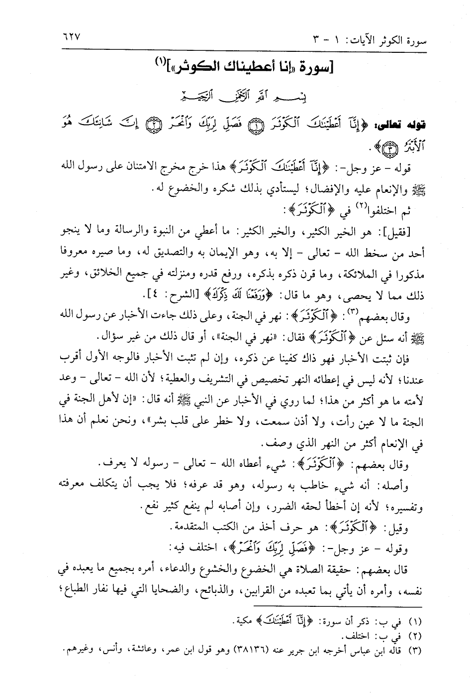 قوله تعالى: (إِنَّا أَعْطَيْنَاكَ الْكَوْثَرَ (1) فَصَلِّ لِرَبِّكَ وَانْحَرْ. إِنَّ شَانِئَكَ هُوَ الْأَبْتَرُ (3).