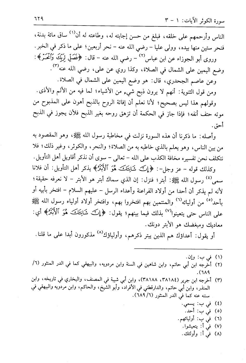 وأصله: ما ذكرنا أن هذه السورة نزلت في مخاطبة رسول اللَّه - صَلَّى اللَّهُ عَلَيهِ وَسَلَّمَ -، وهو المقصود به من بين الناس، وهو يعلم بالذي خاطبه به من الصلاة؛ والنحر، والكوثر، وغير ذلك؛ فلا نتكلف نحن تفسيره مخافة الكذب على اللَّه - تعالى - سوى أن نذكر أقاويل أهل التأويل.