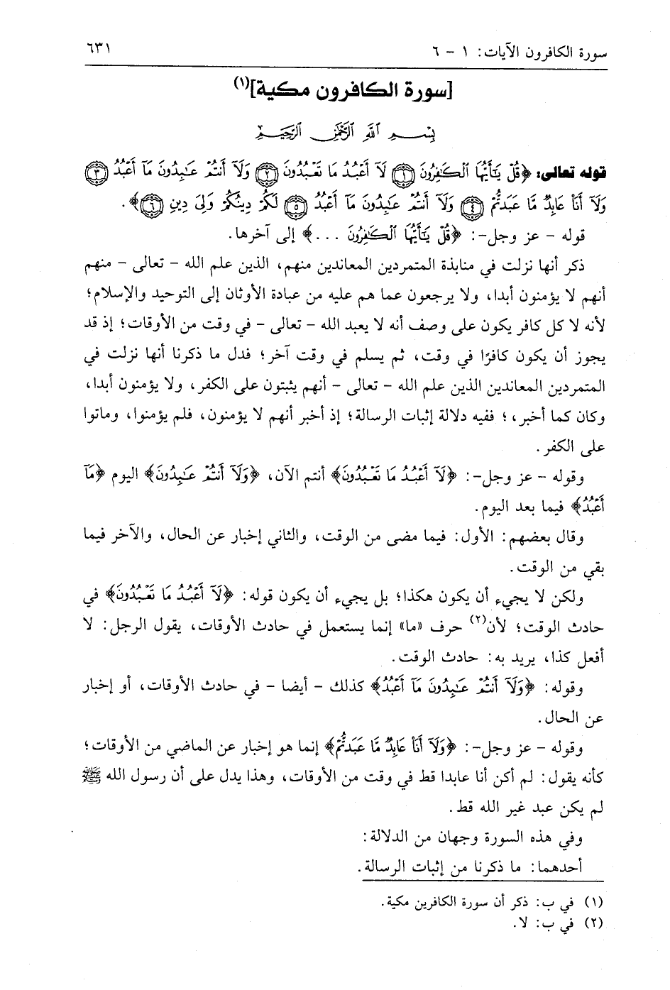 قوله - عَزَّ وَجَلَّ -: (قُلْ يَا أَيُّهَا الْكَافِرُونَ. . .) إلى آخرها.