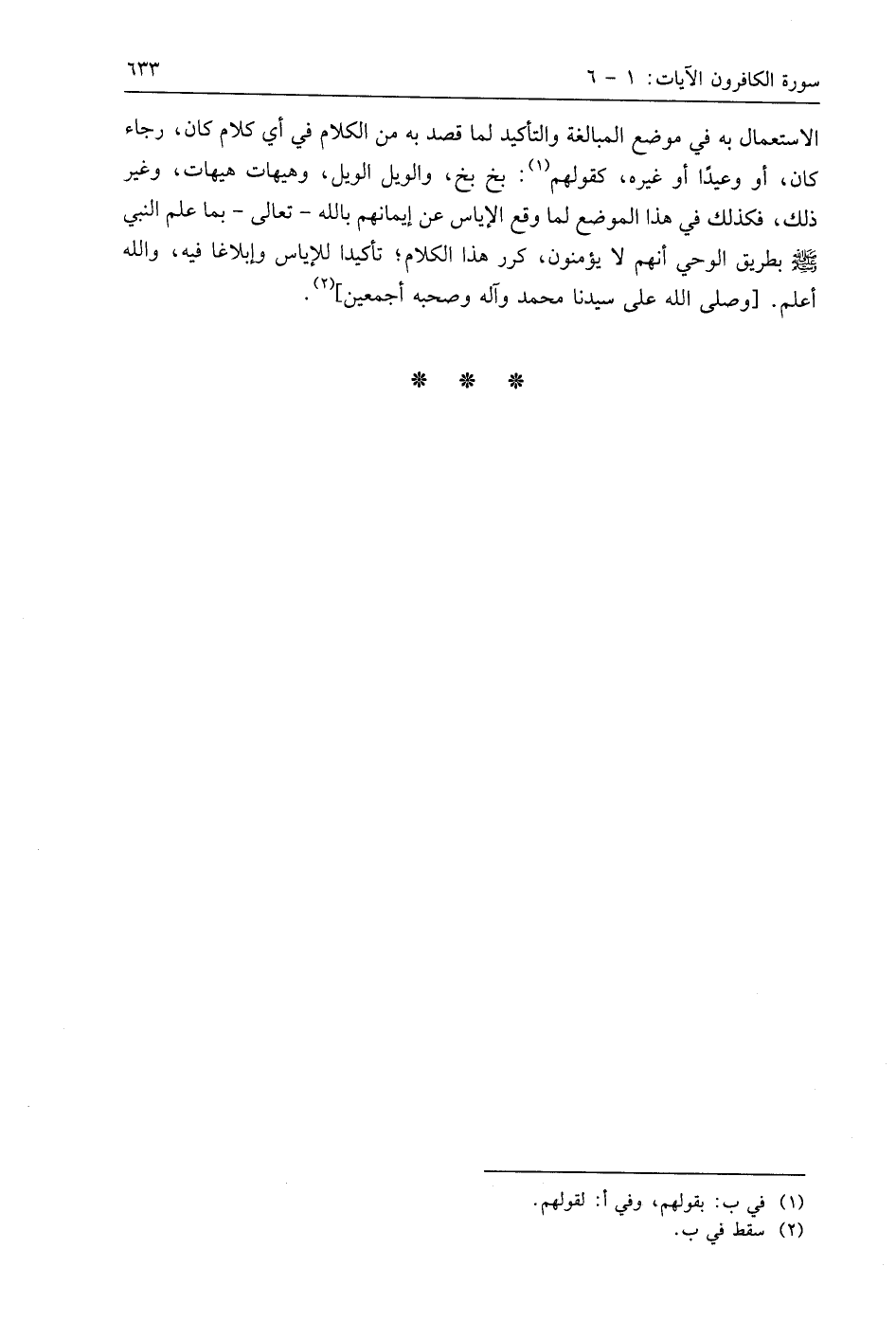 الاستعمال به في موضع المبالغة والتأكيد لما قصد به من الكلام في أي كلام كان، رجاء كان، أو وعيدًا أو غيره، كقولهم: بخ بخ، والويل الويل، وهيهات هيهات، وغير ذلك، فكذلك في هذا الموضع لما وقع الإياس عن إيمانهم باللَّه - تعالى - بما علم النبي - صَلَّى اللَّهُ عَلَيهِ وَسَلَّمَ - بطريق الوحي أنهم لا يؤمنون، كرر هذا الكلام؛ تأكيدا للإياس وإبلاغا فيه، والله أعلم. وصلى اللَّه على سيدنا مُحَمَّد وآله وصحبه أجمعين.