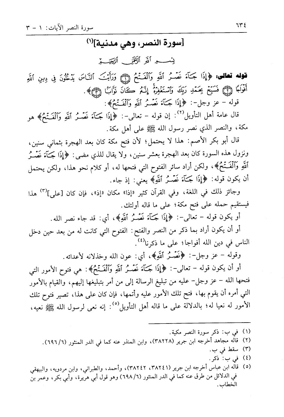 قال عامة أهل التأويل: إن قوله - تعالى -: (إِذَا جَاءَ نَصْرُ اللَّهِ وَالْفَتْحُ) هو مكة، والنصر الذي نصر رسول اللَّه - صَلَّى اللَّهُ عَلَيهِ وَسَلَّمَ - على أهل مكة.