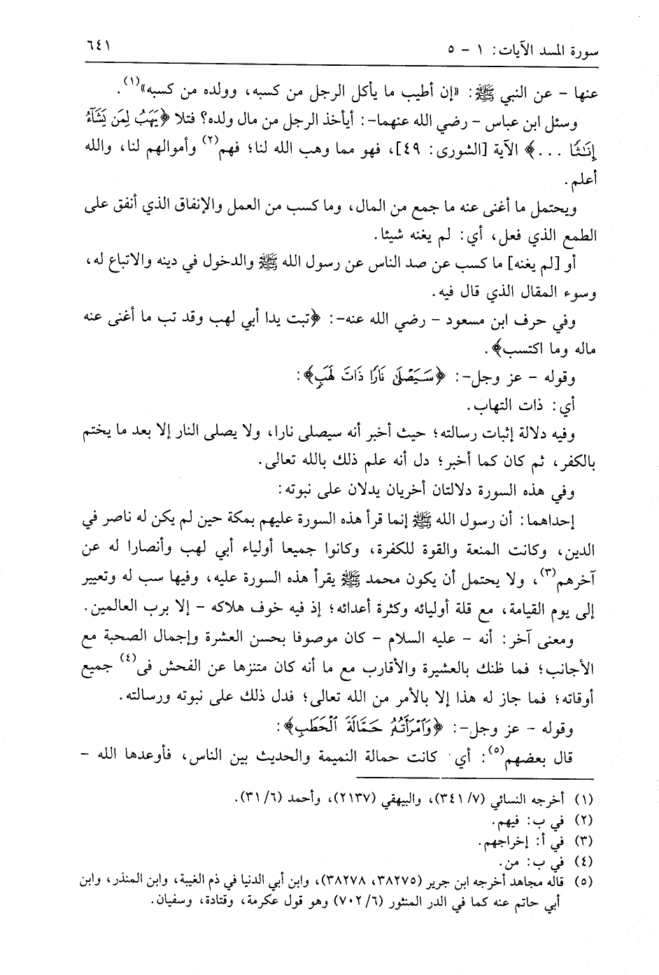 إحداهما: أن رسول اللَّه - صَلَّى اللَّهُ عَلَيهِ وَسَلَّمَ - إنما قرأ هذه السورة عليهم بمكة حين لم يكن له ناصر في الدِّين، وكانت المنعة والقوة للكفرة، وكانوا جميعا أولياء أبي لهب وأنصارا له عن آخرهم، ولا يحتمل أن يكون مُحَمَّد - صَلَّى اللَّهُ عَلَيهِ وَسَلَّمَ - يقرأ هذه السورة عليه، وفيها سب له وتعيير إلى يوم القيامة، مع قلة أوليائه وكثرة أعدائه؛ إذ فيه خوف هلاكه - إلا برب العالمين.