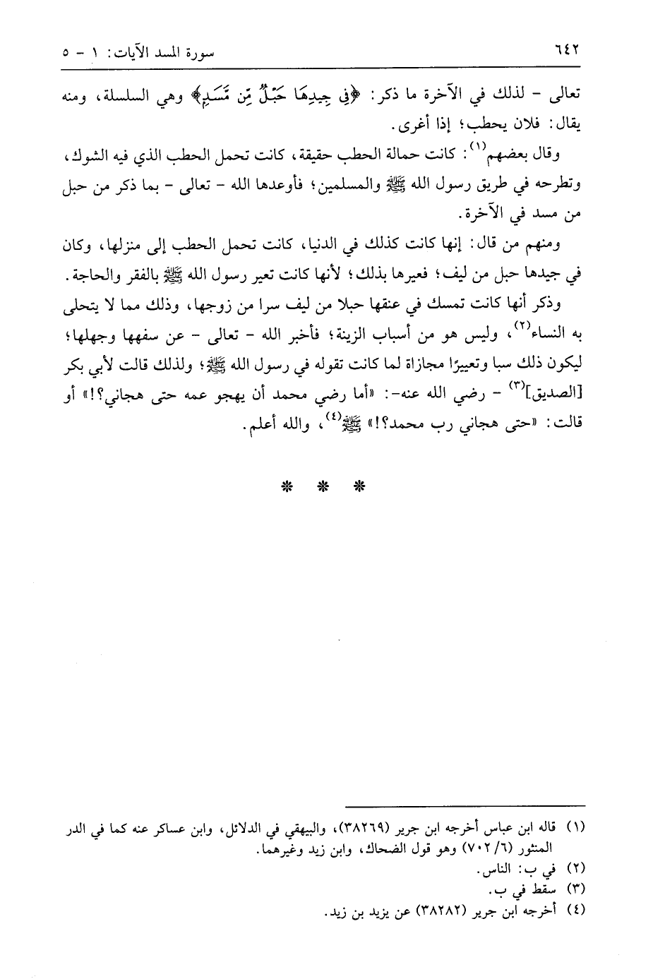 وذكر أنها كانت تمسك في عنقها حبلا من ليف سرا من زوجها، وذلك مما لا يتحلى به النساء، وليس هو من أسباب الزينة؛ فأخبر اللَّه - تعالى - عن سفهها وجهلها؛ ليكون ذلك سبًّا وتعييرًا مجازاة لما كانت تقوله في رسول اللَّه - صَلَّى اللَّهُ عَلَيهِ وَسَلَّمَ -؛ ولذلك قالت لأبي بكر الصديق - رَضِيَ اللَّهُ عَنْهُ -: " أما رضي مُحَمَّد أن يهجو عمه حتى هجاني؟! " أو قالت: " حتى هجاني رب مُحَمَّد؟! " - صَلَّى اللَّهُ عَلَيهِ وَسَلَّمَ -، واللَّه أعلم.